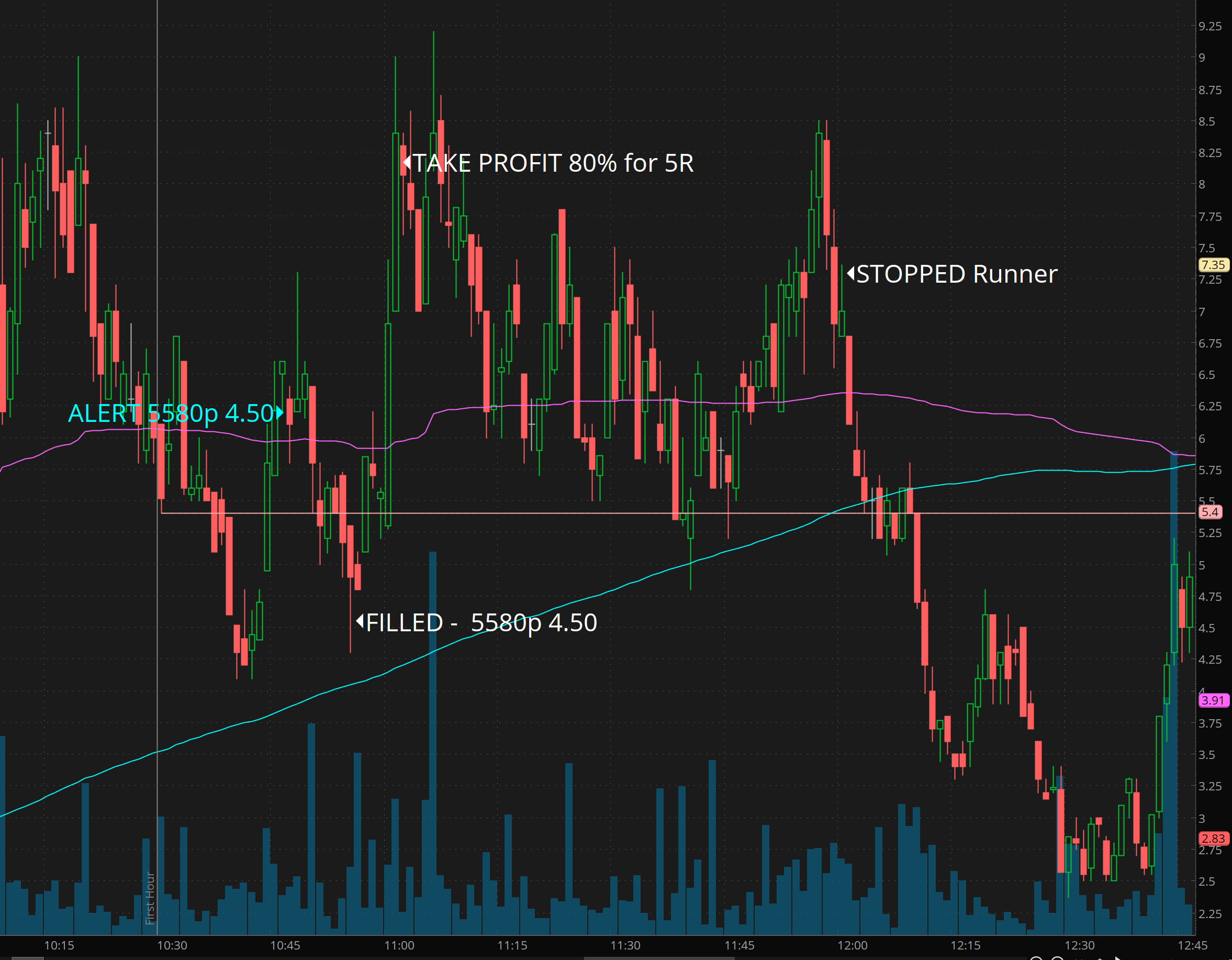 Trade 1: Alerted 5580p for 4.50 these popped 100%. The fill came about 10 minutes AFTER the alert. and Take Profit with 15 minute later. We planned for the bounce at 559.50 and took our high probable win plus I gave it a chance in case 559.50 broke.