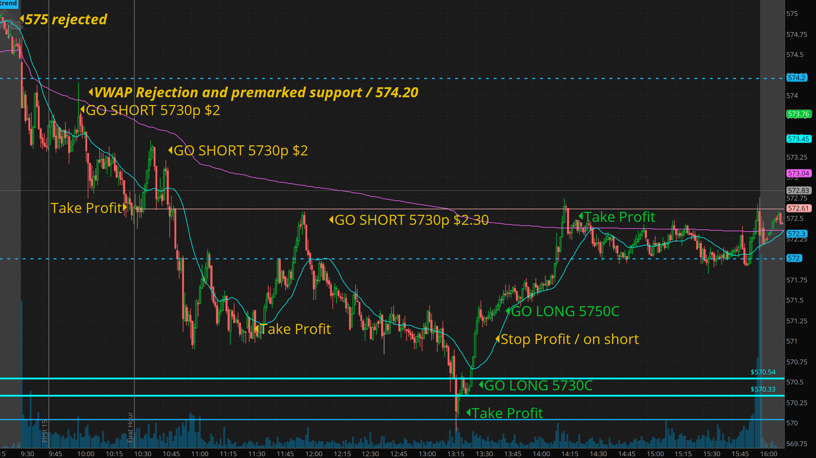 SPY - 11:20am - signaled for a pop 18 minutes before reversal started for 572.50 backtest
