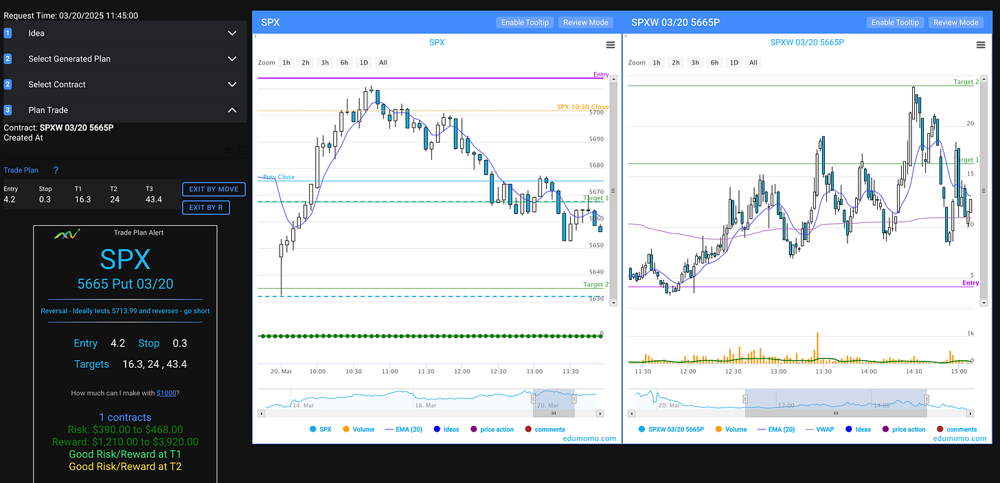 Let me break it down. In this example, I’m clicking 11:45 candle on left so assume it is 11:46. Within seconds, Edge provides a number of plans. While I was hawking 5650 for 2-2.50. Edge AI said 4.2 on 5665p and ride it. Essentially we hit 300-500% gains in about 2.5 hours! The best part, never came close to original entry.