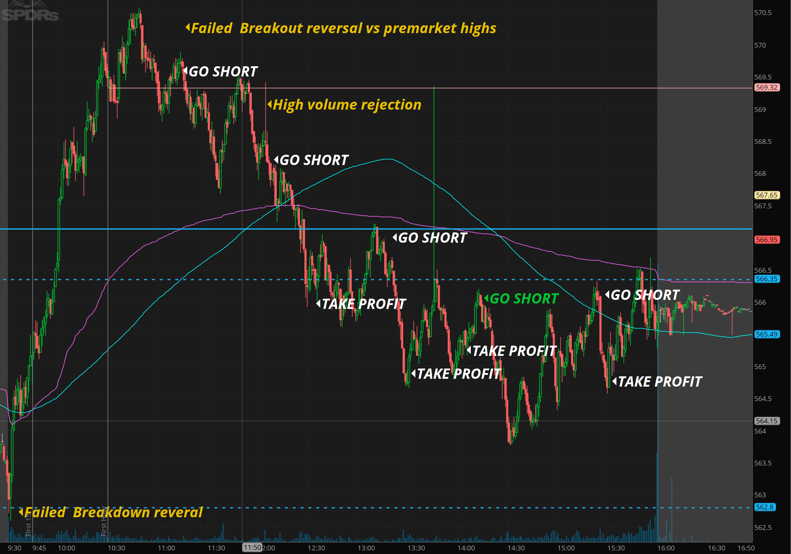 Another solid day and we almost captured the full range again on the downside! So I missed long this morning out of the gate on the large gap down. I’m OK with that. Remember how i was ranting yesterday about not getting the 570-572 area for a short? Well guess what happened, the market gods love me! SPY ripped to 570+.