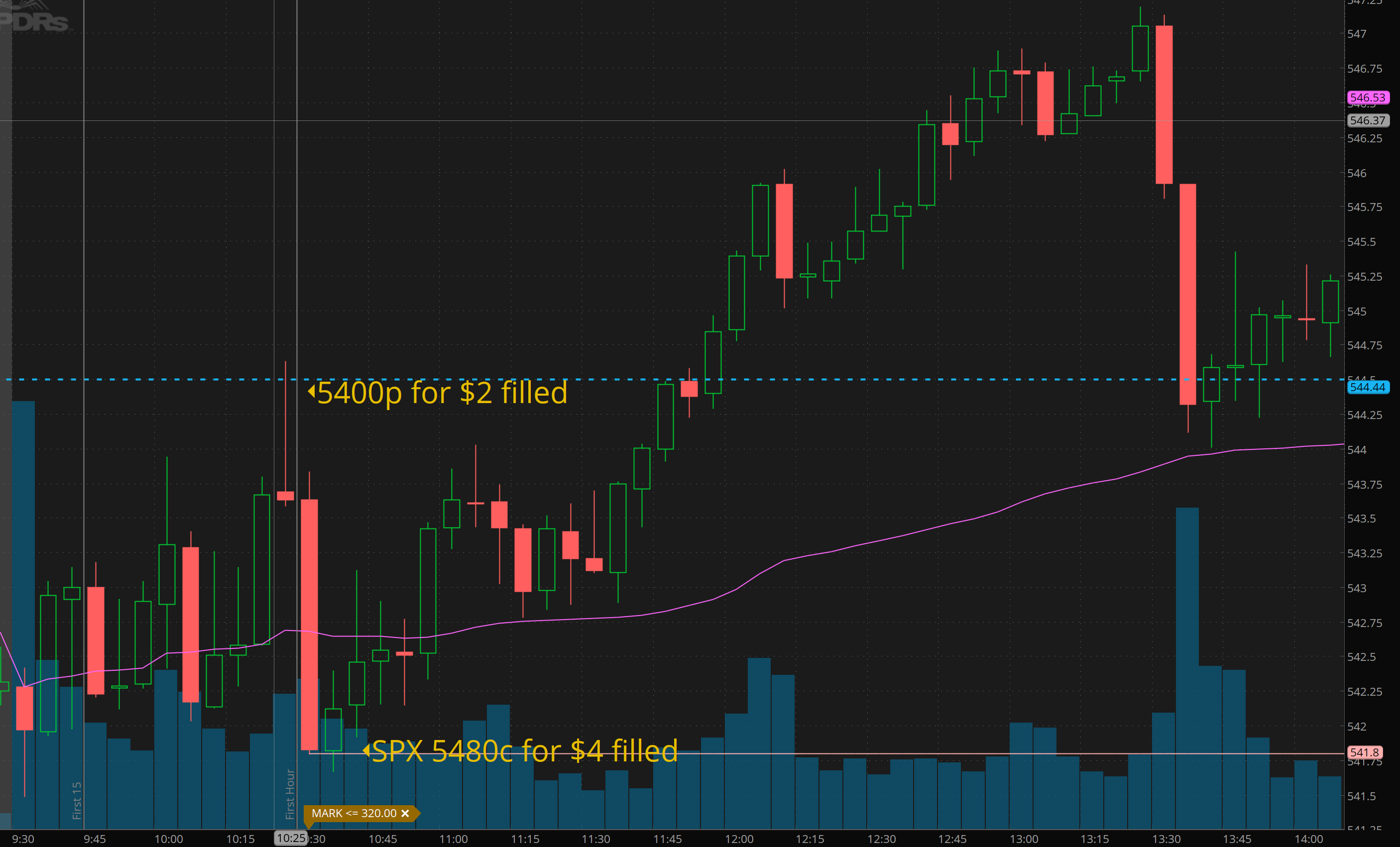 This was a bit more tricky. I was net bullish, but I wanted some gap fill before going long. I essentially set orders in on 5480c and 5400p during first hour that filled.