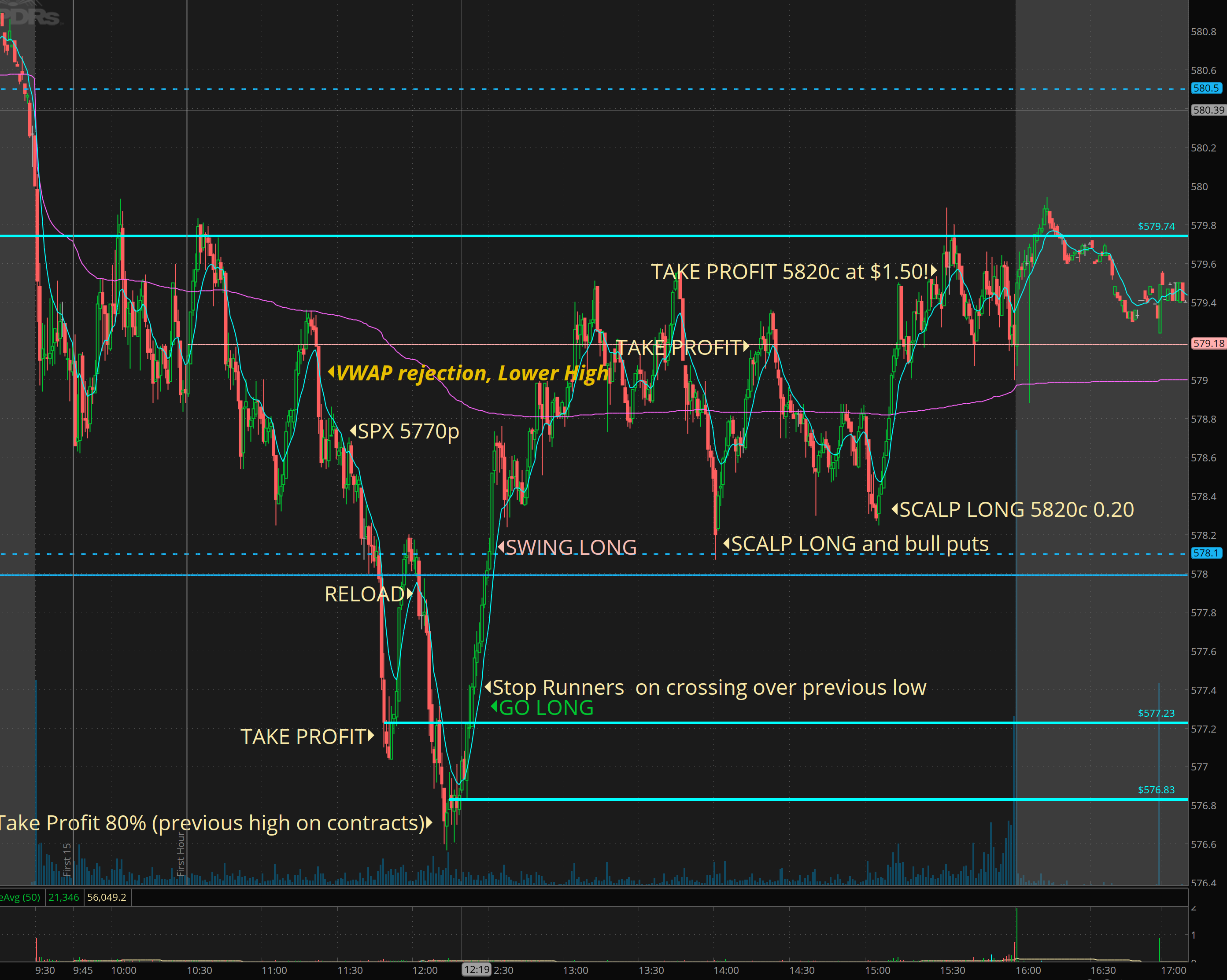 Notice the 5770p and the trigger being the VWAP rejection after 10:30 and then seeing the support about to break.