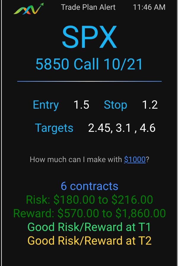 Oct 11 - SPX 5810c $5 → $14 ($5000 —> $14000 potential)
