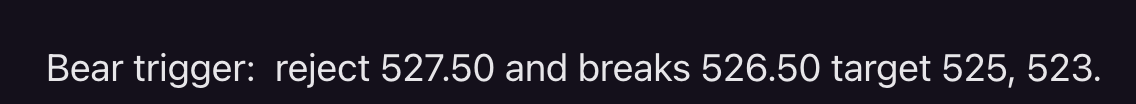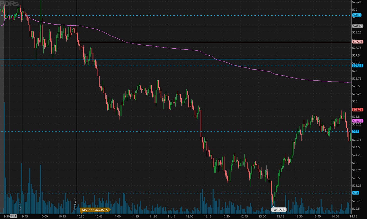 It almost like SPY followed my script exactly. After the first hour, SPY broke 527.50, then broke 526.50 and then came back and back tested 526.50 and then dumped into 523 and cleanly breaking 525.