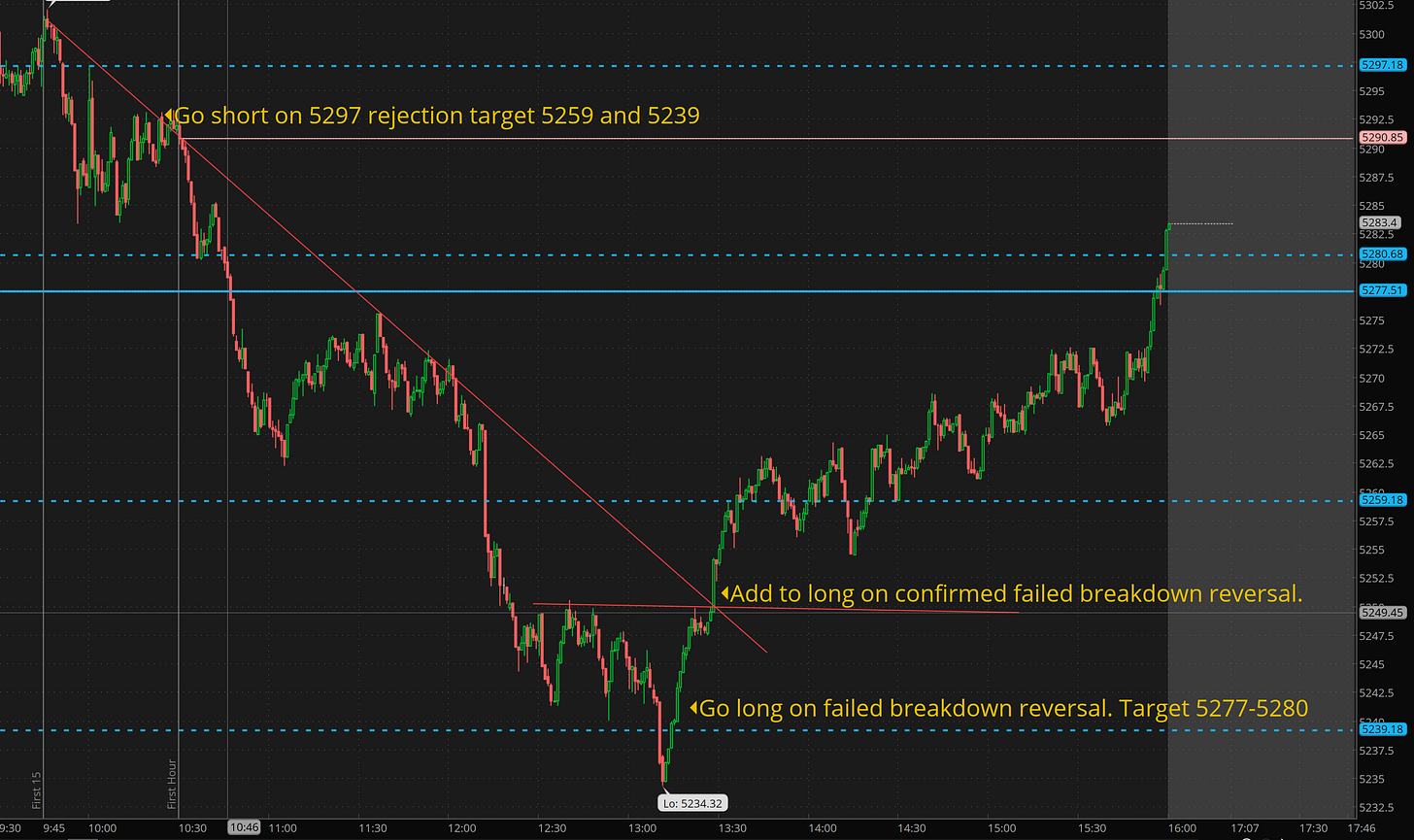 Yesterday the key was to get short early on pops during first hour on 5280p, or one could take 5250p for $3 after the first hour. We got both. The 5280p hit 45 on the level below and the 5250p hit $20!