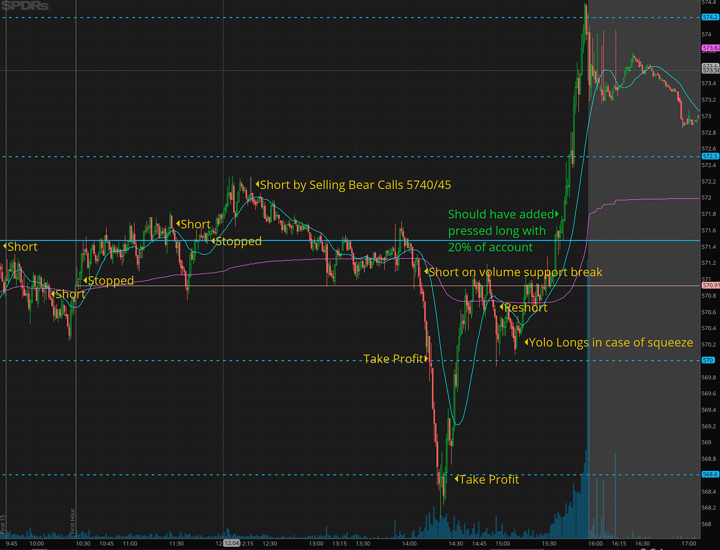 Basically market chopped around while waiting for Powell. They then flushed it under 569 support. BUT then the unthinkable happened. 569 reclaimed which openned the door to a failed breakdown reversal setup.