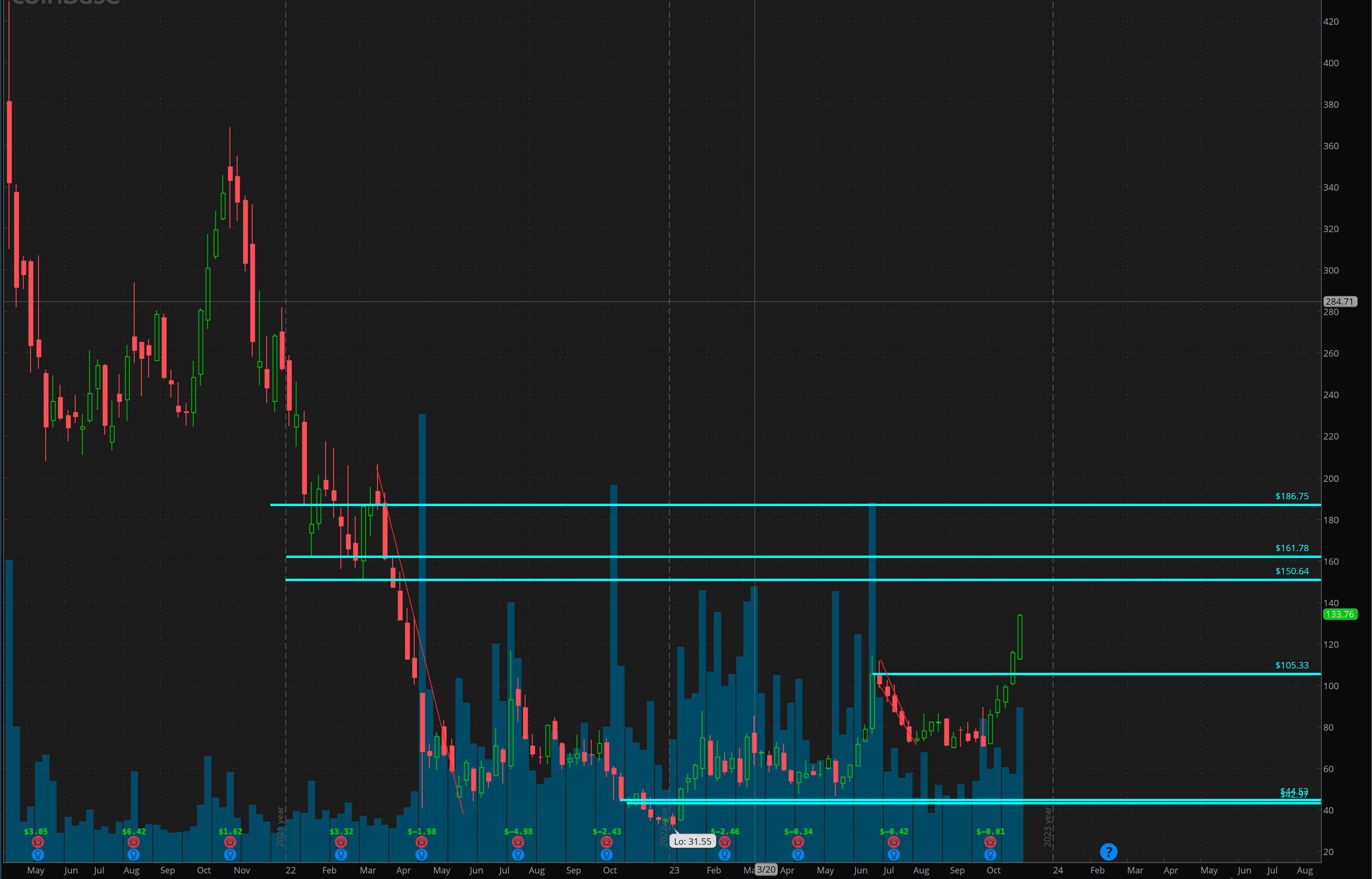 This morning COIN is gapping up. I’m targeting 155-165 for an exit on calls this week.