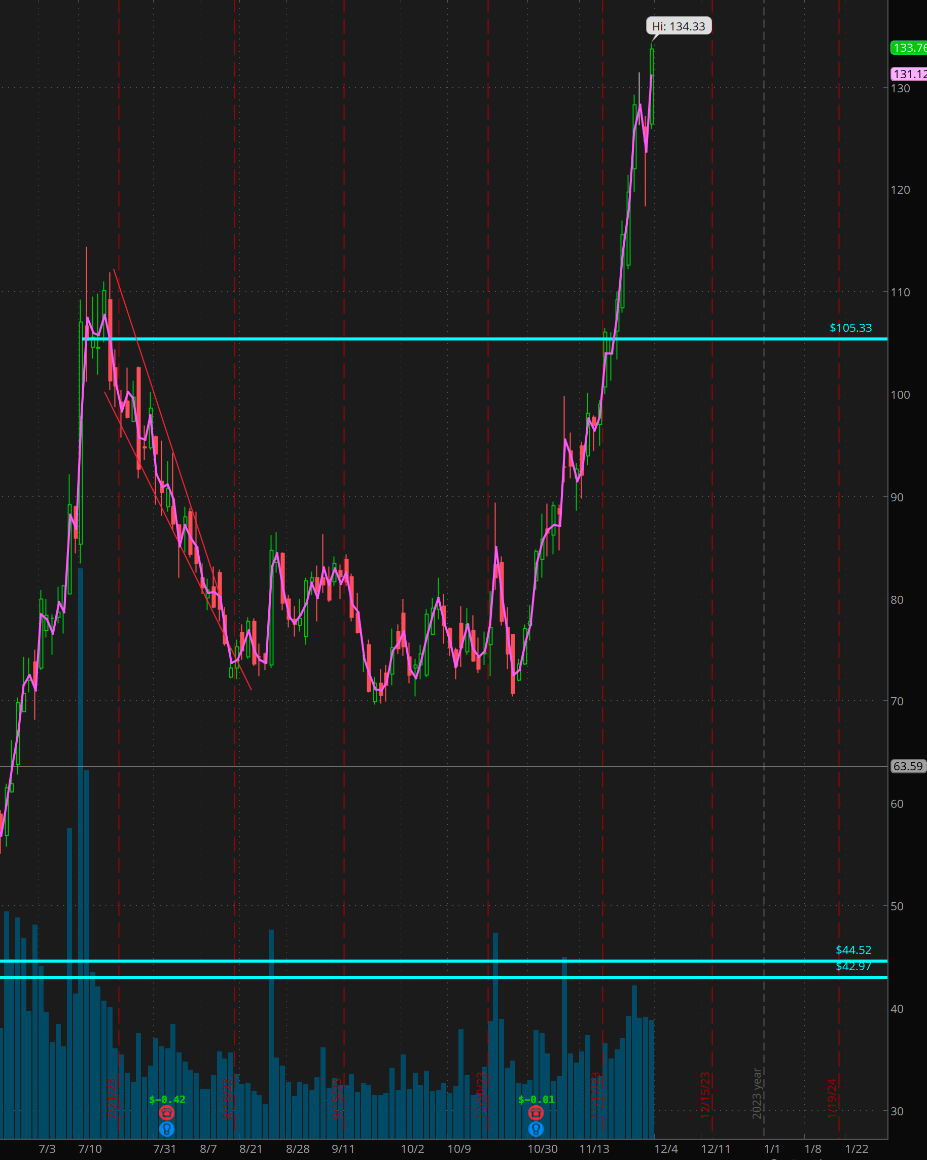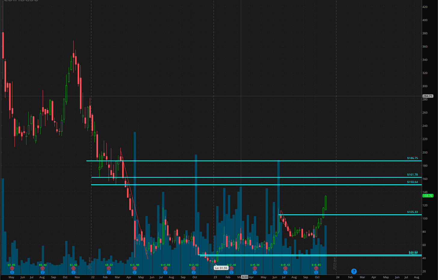 Back when COIN was around 108 I had mentioned I liked COIN and MSTR for swing long. This morning we are gapping up over 140. Bitcoin had based for last 5 or 6 months and was breaking out. I really wanted one more dip, but it never developed on it and now FOMO buyers should start showing up.