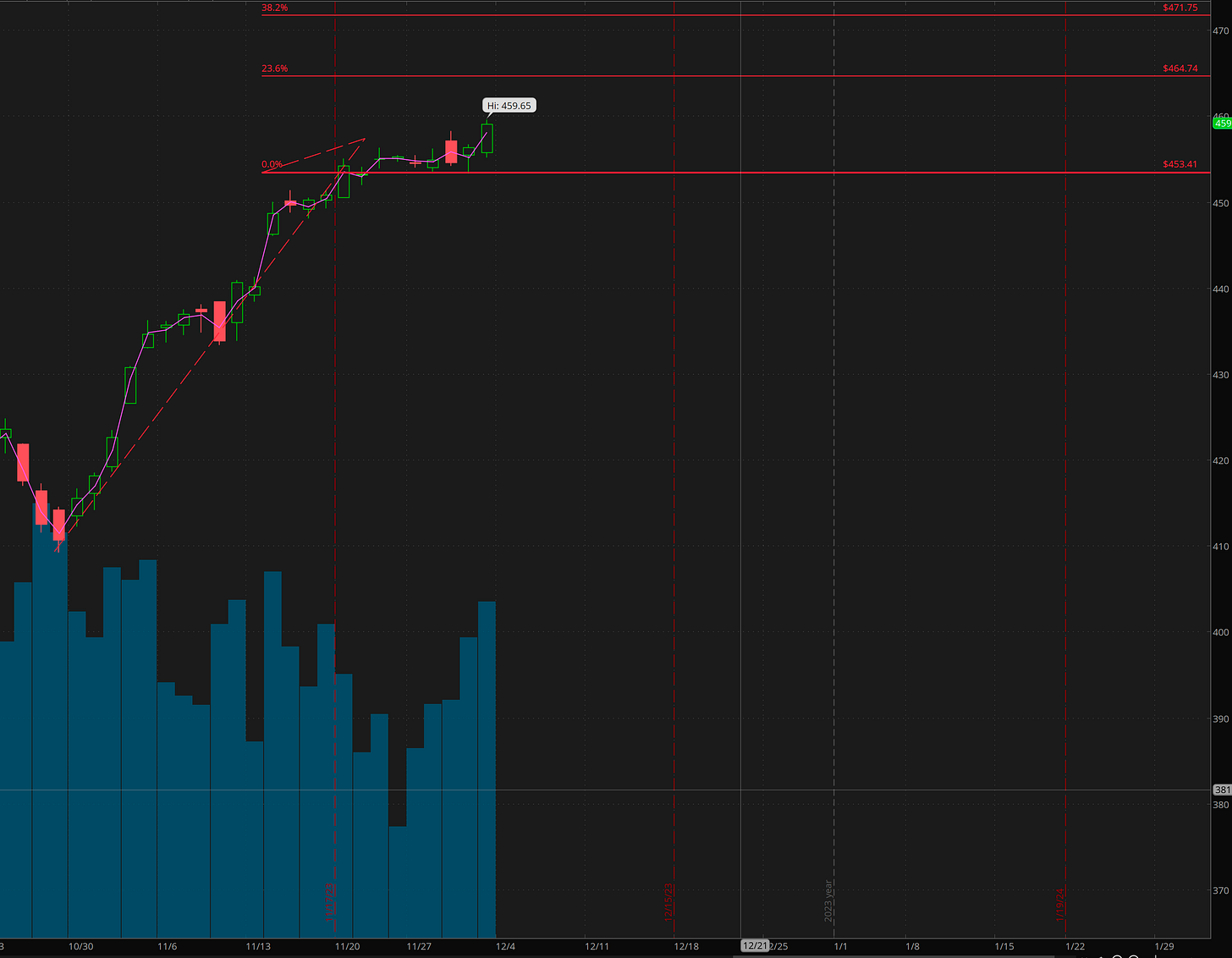 SPY 0.00%↑ is gapping down this morning, but if the rally continues into a Santa rally, and SPY 453.50 hold, this is my projection/targets for the month of December.