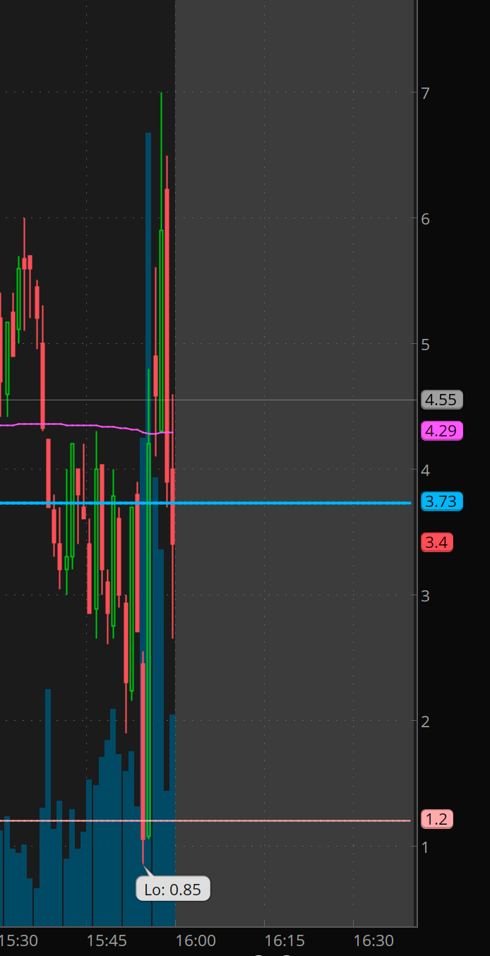 And sure enough we got a dip into $0.80 and then ripping into 7 before closing at around 3.40. What an exciting close. This is why I stress on planning and discount shopping., placing orders in advance get let you get filled at great risk/reward prices.