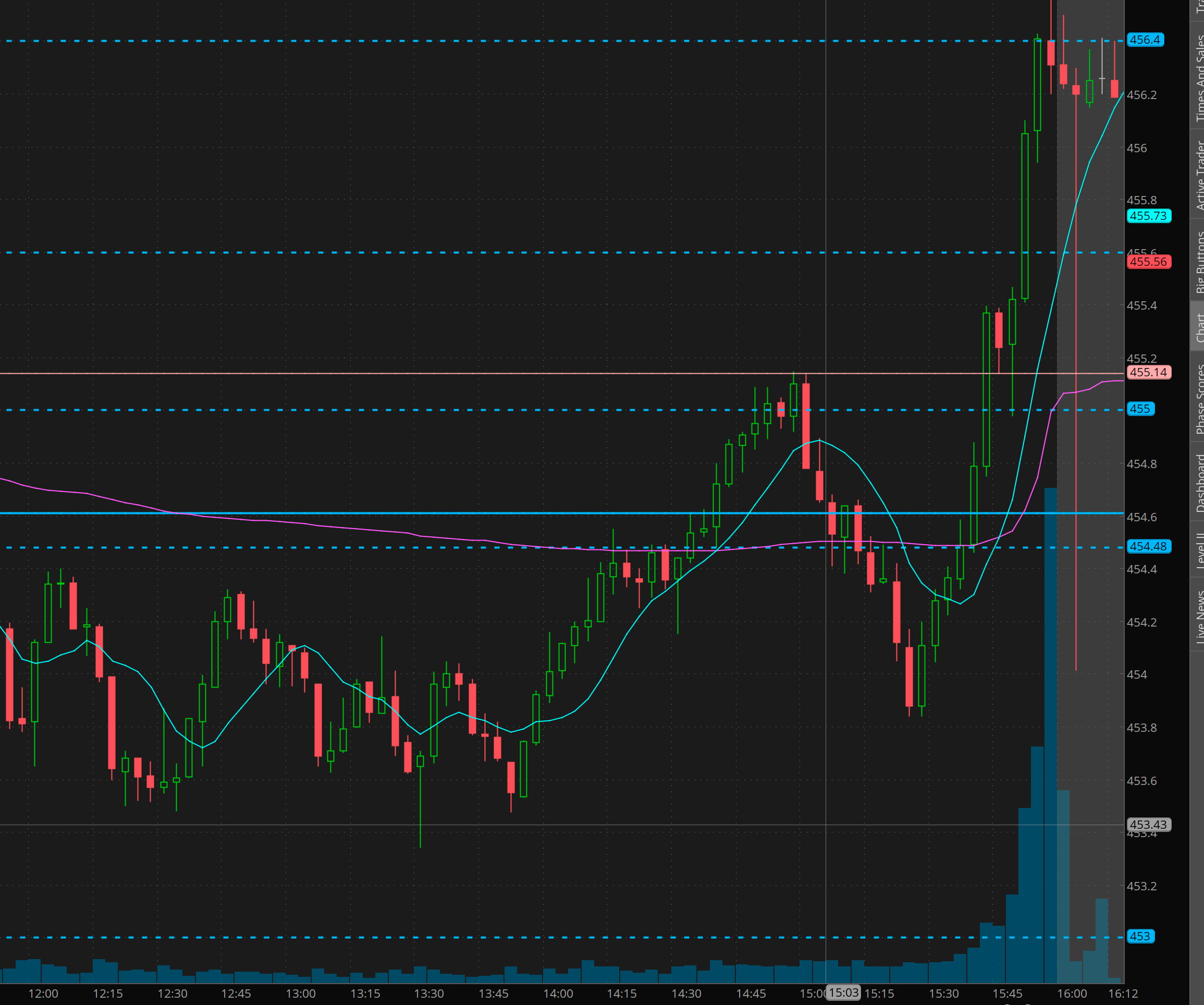 After seeing the lunchtime and first hour price action, I started anticipating that we would get a squeeze in the last hour. Why? We had a failed break down reversal candle and 453.50 was strong support. I also used edge and noticed what appeared to be premium selling instead of directional buying.