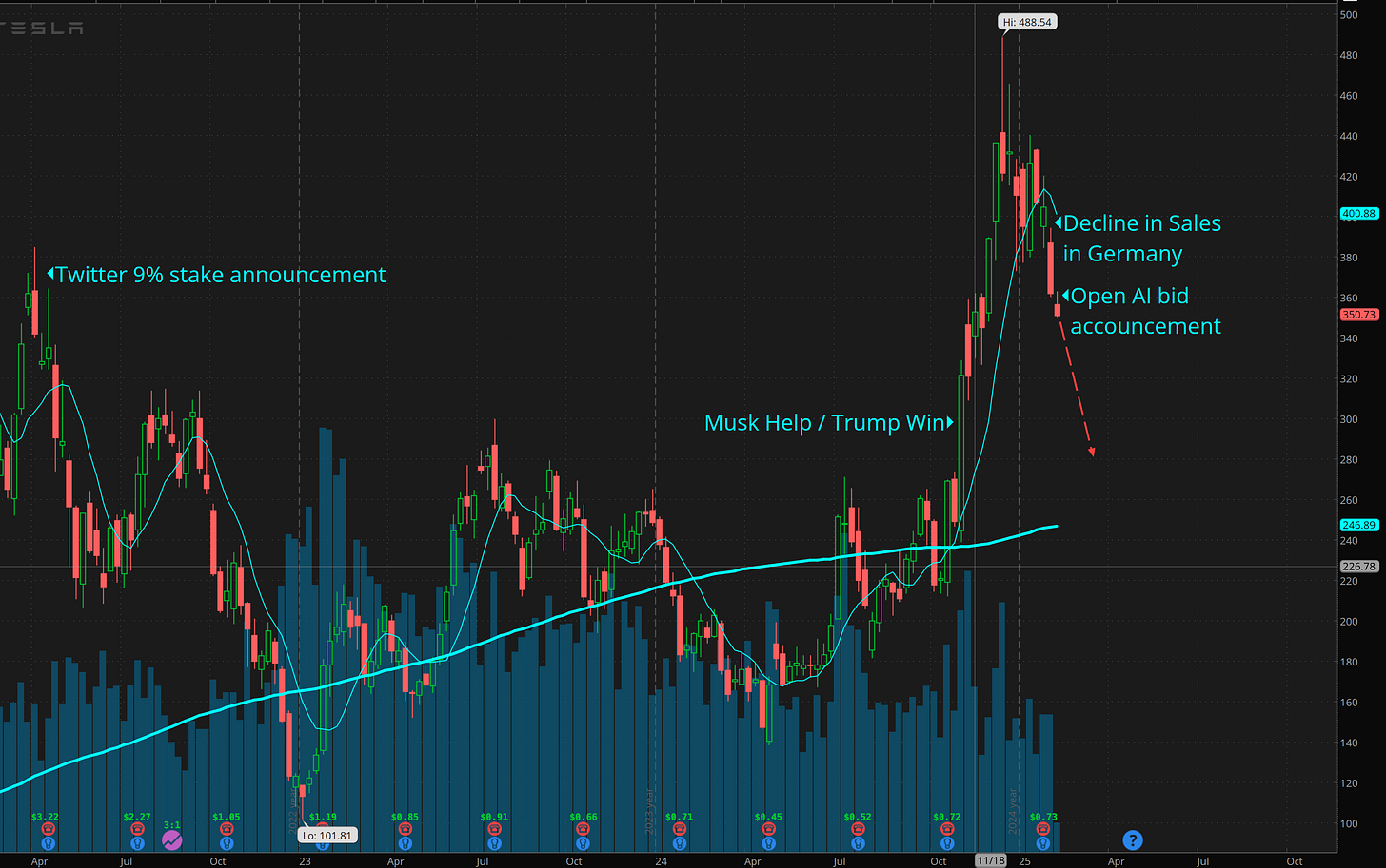 Tesla just broke a key support level at $360 a level that signaled a breakout last October and had held for months. Investors are already on edge, and now with Musk distracted by OpenAI, X, and DOGE, the risk of further downside is growing fast.