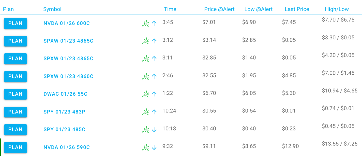 Below is the timing and the alerts using the criteria I like. As you can see there were only 3 before lunch. There will be days like this. Recognizing this had me stop for day trades and just let swing trades work.