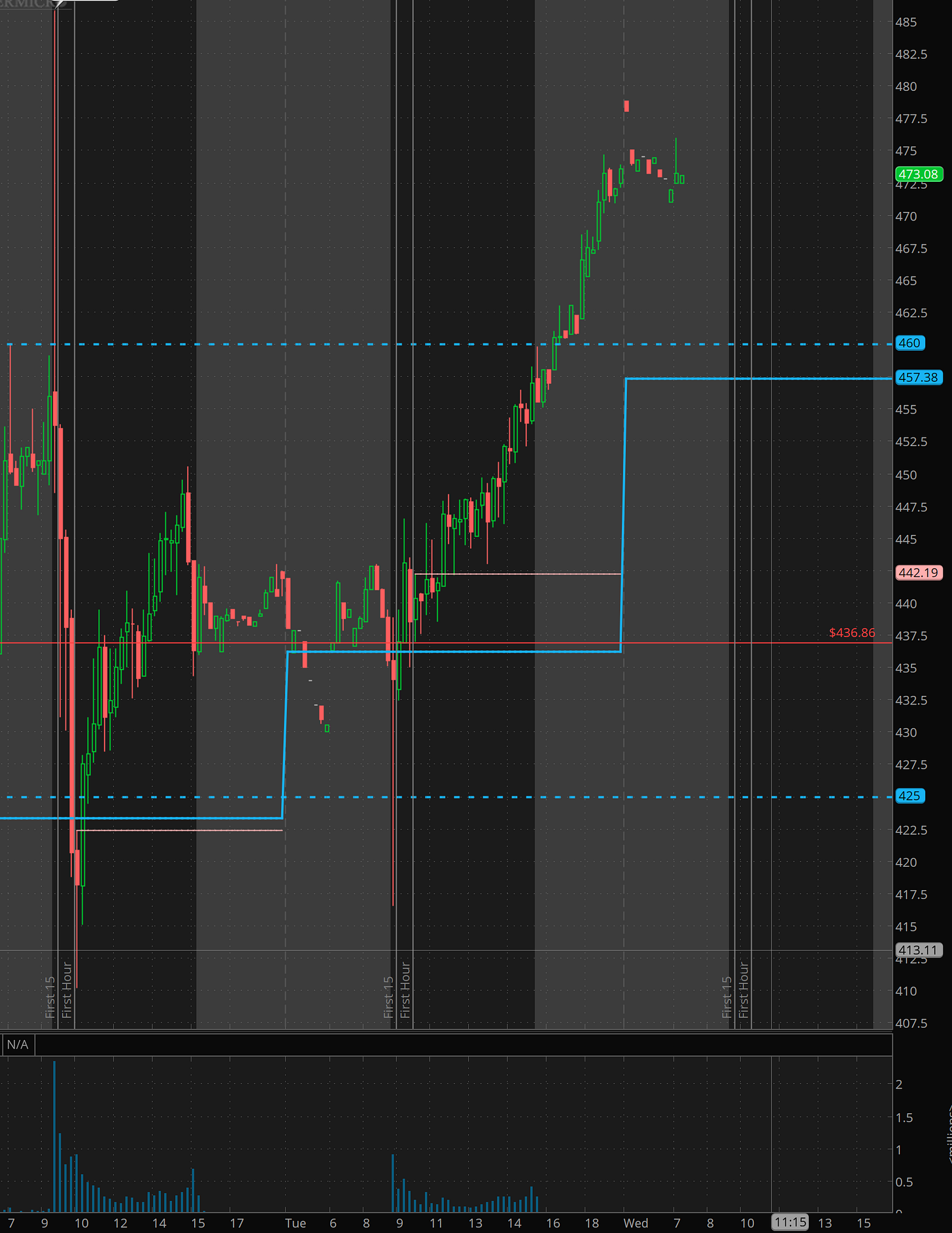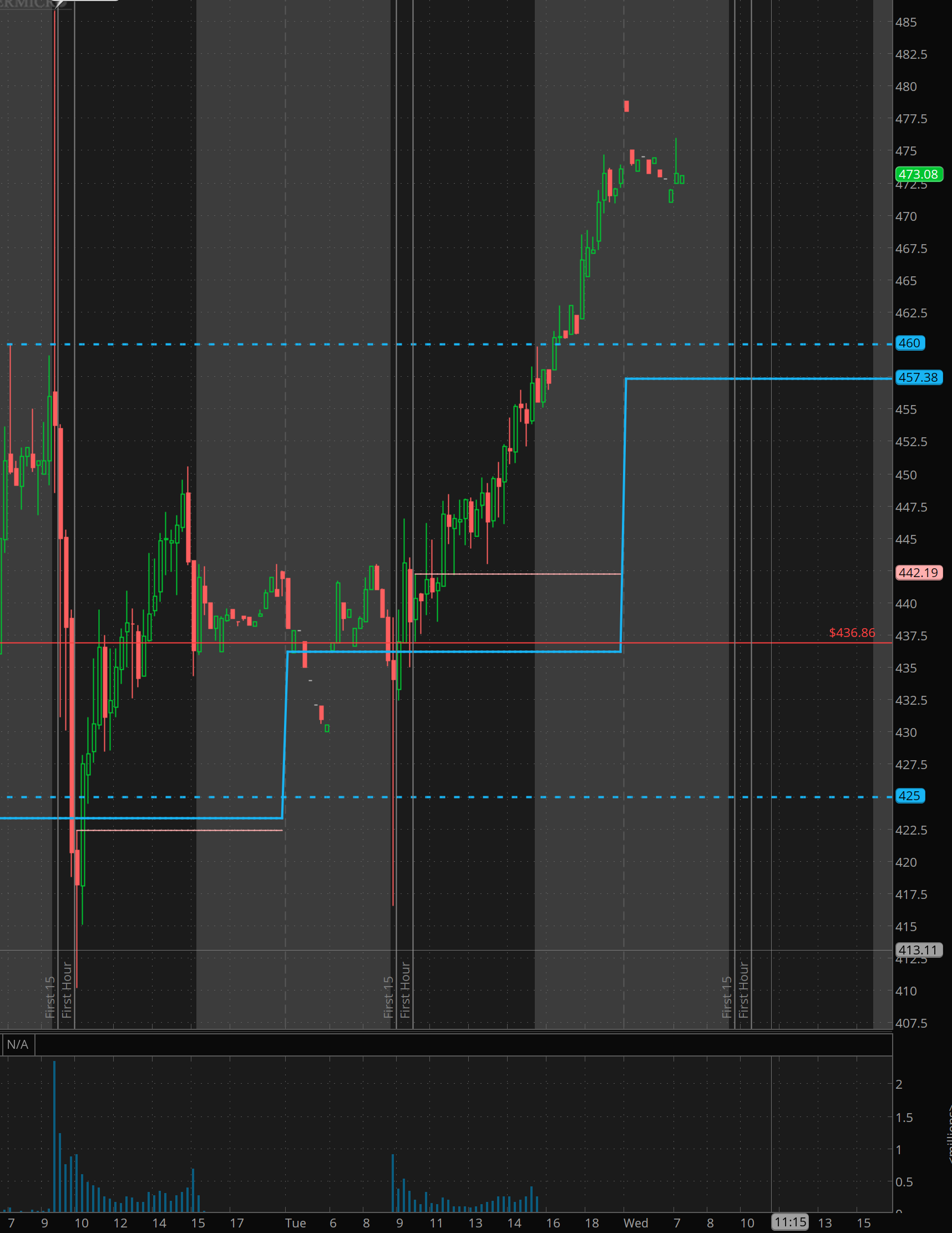 yesterday I wrote I wanted a dip into 390-410 in an ideal world targeting 460-480+ as a swing. we dipped into 415 and quickly reversed and are gapping near 480 this morning.