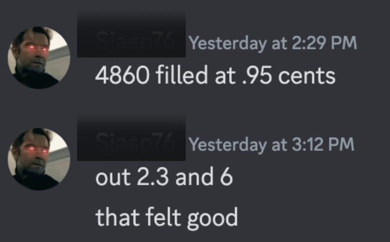 I alerted filling at 2.50 and selling at 4 and 4.50. got stopped on the runners. I was so frustrated because I had 0 doubt a rally in latter part of week is coming, but I wasn’t getting the dip I wanted to load up for a 10x trade.