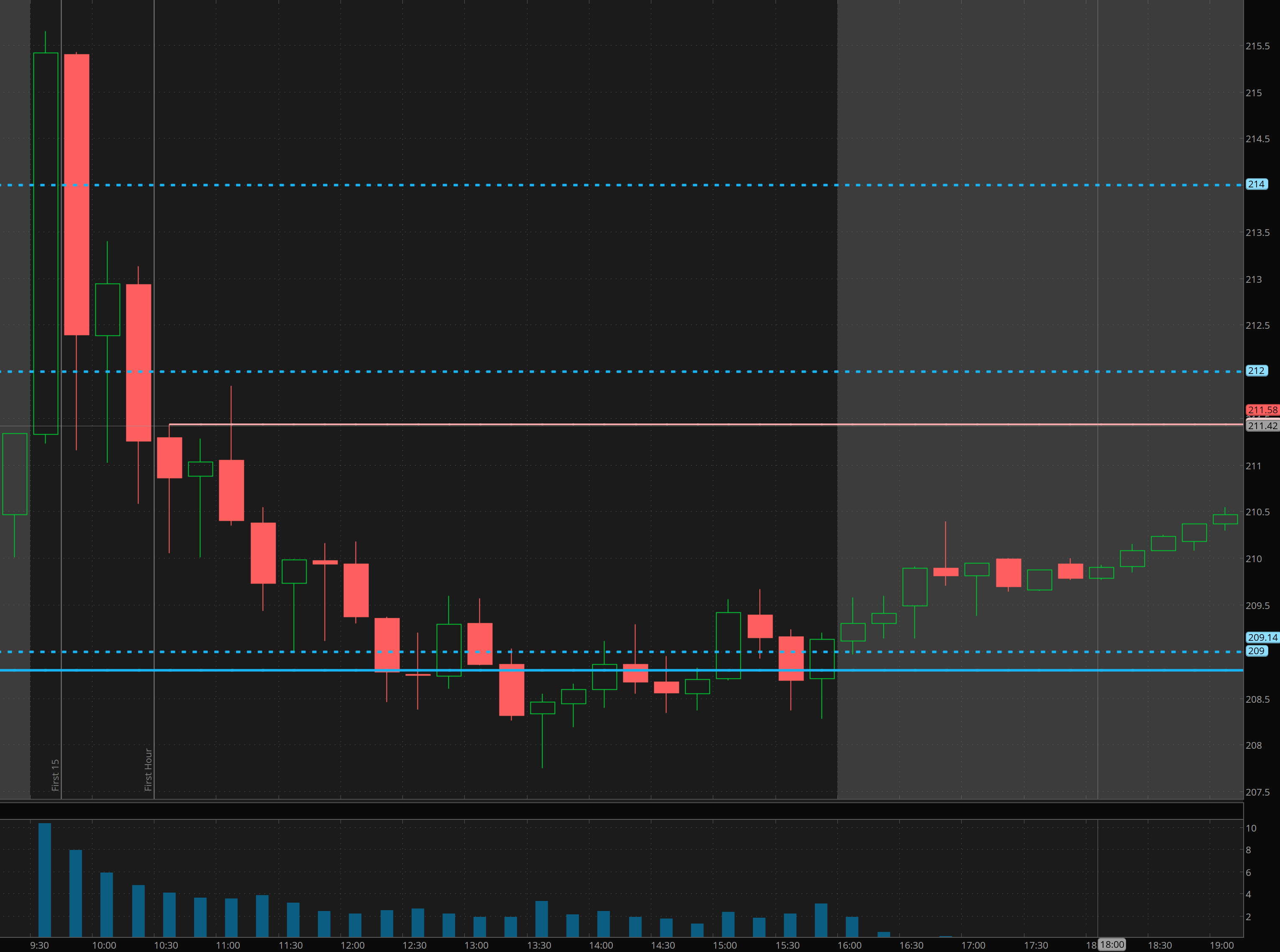 Yesterday I wrote that TSLA could be pinned around 209. We got a fast push into 215 and then faded and was pinned around 209. TSLA reports tonight.