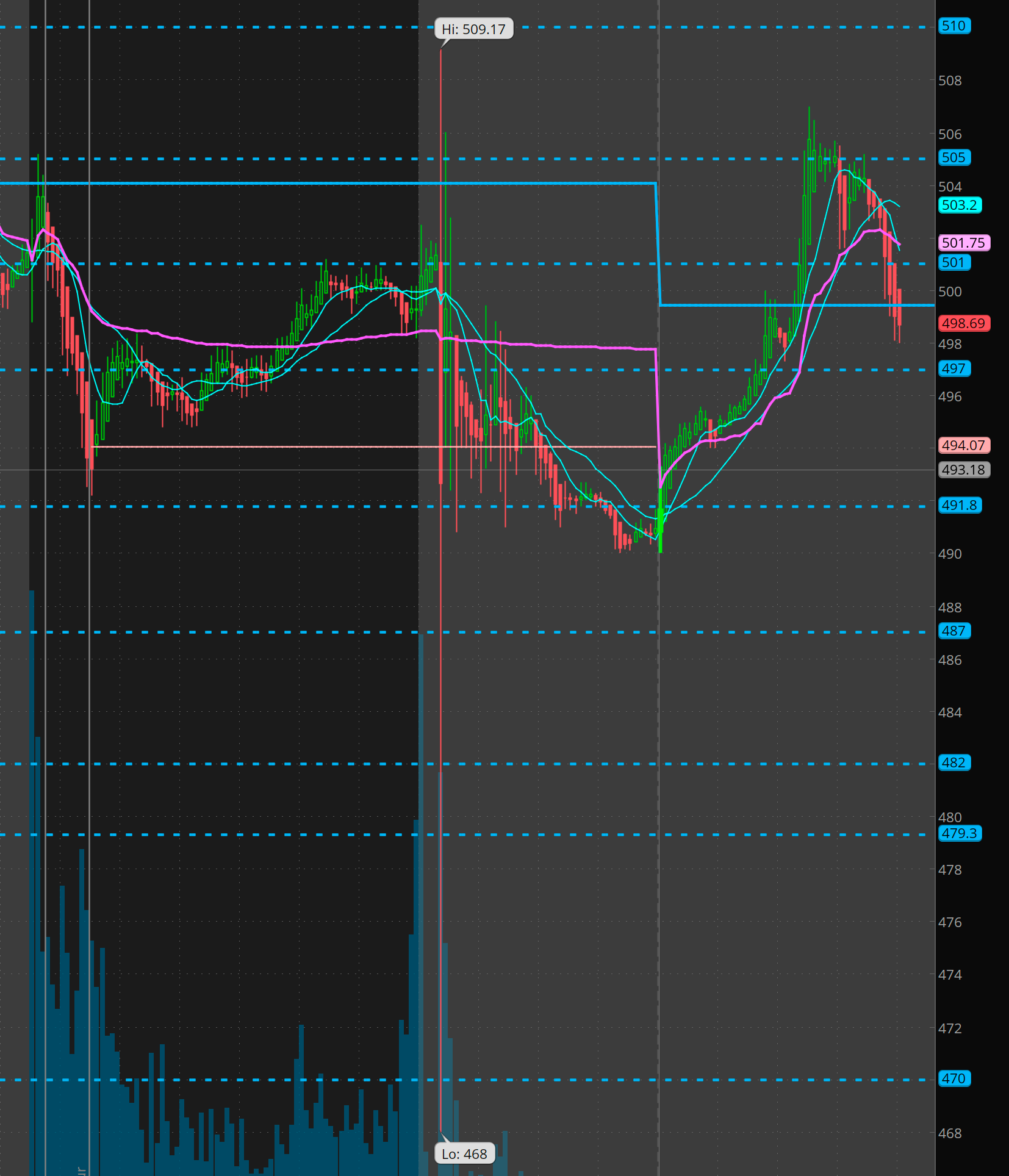 NVDA had a strange panic yank/candle down into 470 that was quickly bought up. Overall the results were impressive but then why the dip? Likely lopsided positioning or not as impressive as many hoped and when demand didn’t show up, selling triggered. That said the dip into 490-492 was bought and NVDA got back over 500 in premarket.