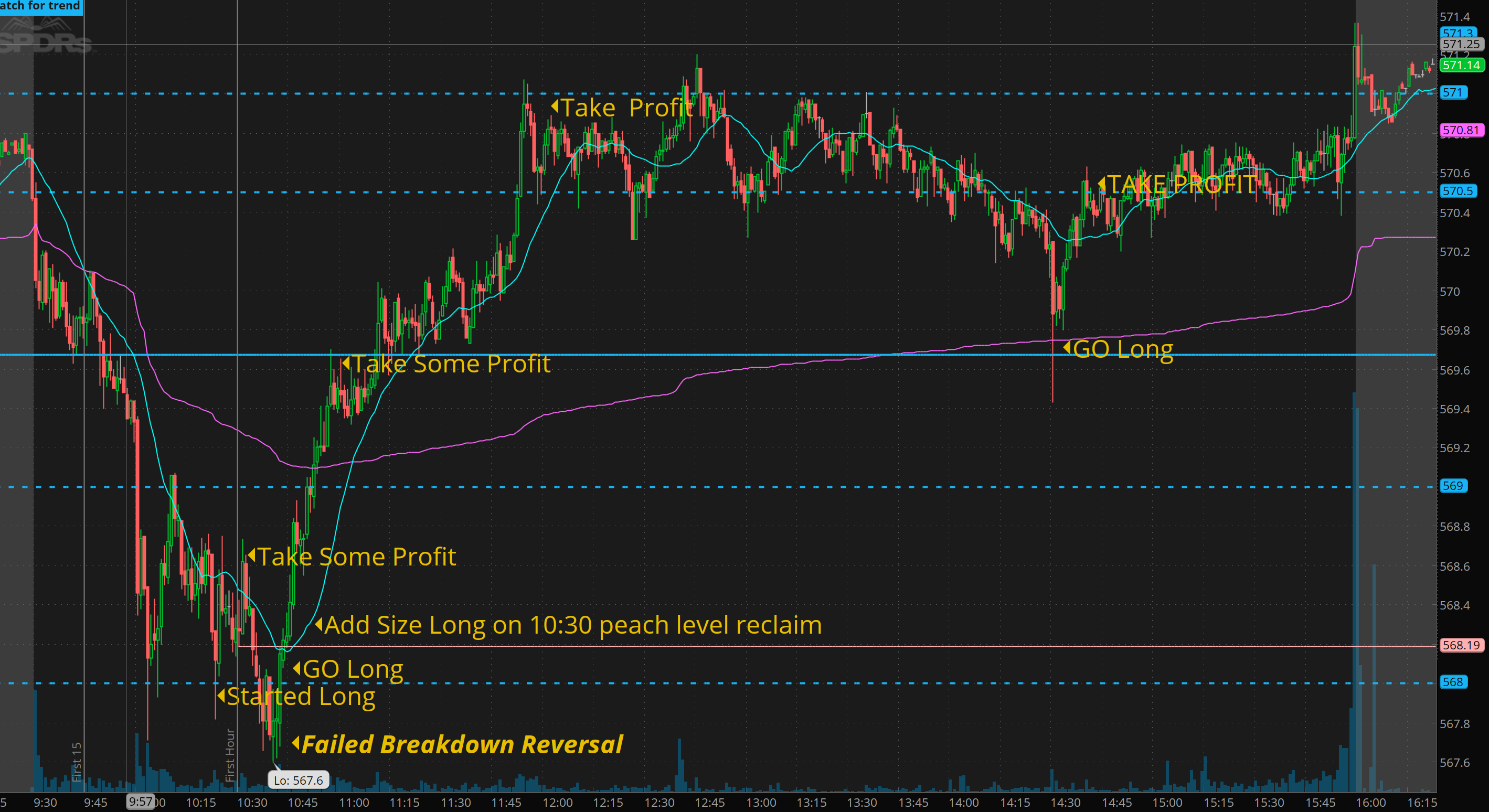 Notice how the average call volume increased as we were moving into the lows just after 10:30 and then on reclaim over 568.20 continued and then the volume dried up at the highs (great time to exit!)