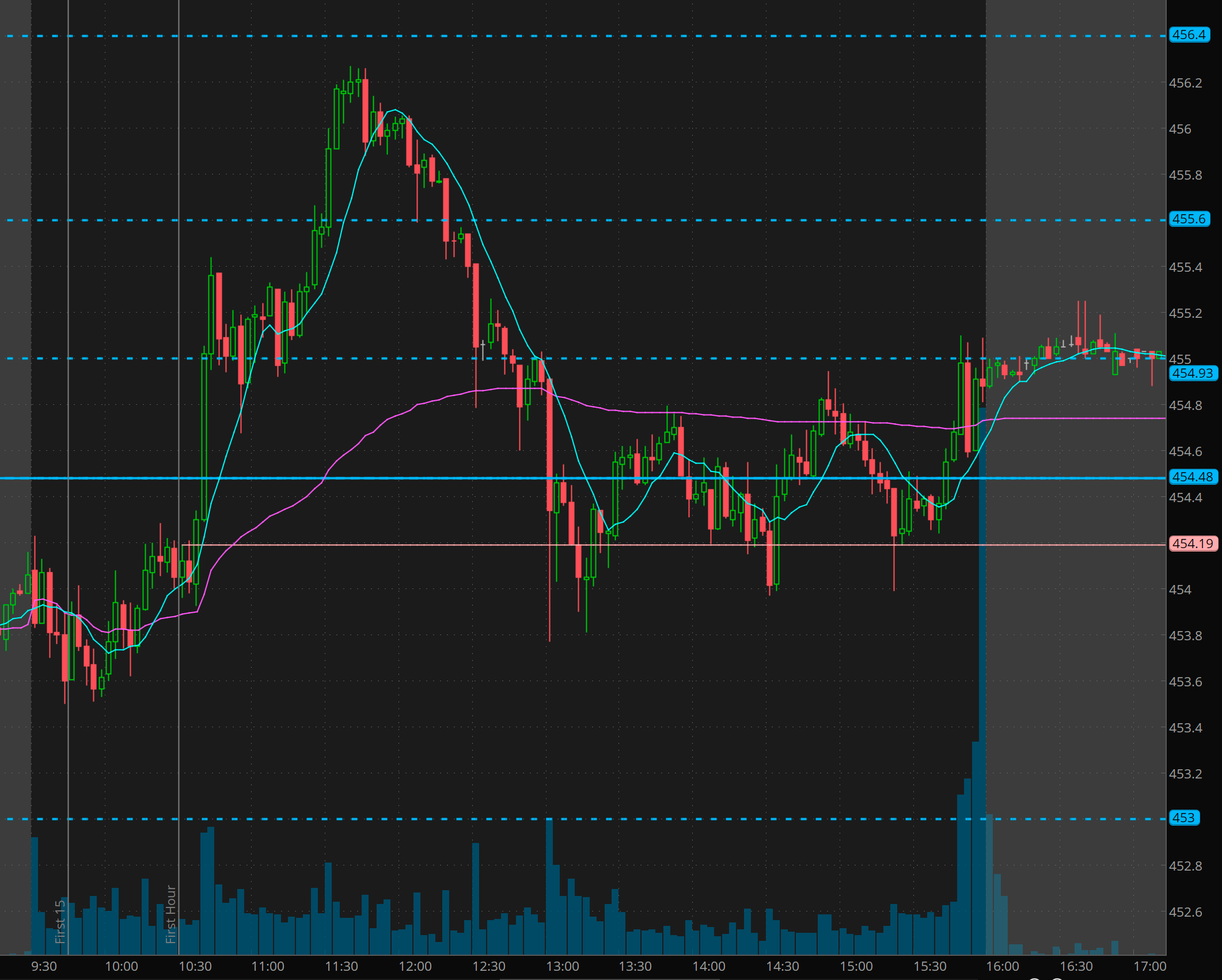 Ok, so SPY is seriously gapping up. I can’t chase it long. If we get a back test on 456, I will go long, we break 454/453, I will use that as my signal to load up short. Until then at the moment, market is in full blown BTFD mode.