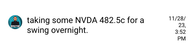 Given the basing action into the close and hold of 475, I suggested taking NVDA calls for a swing overnight. These should at least double or triple by the open/end of day.