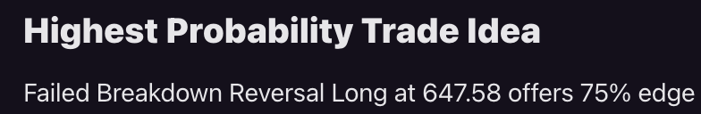 649.59: Premarket close level; shows support from recent action with volume spike, 70% hold probability, for all trader types throughout day.
