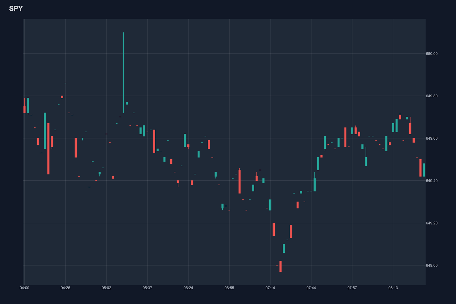 SPY shows consolidation in premarket, with price action bouncing between 649 and 650. The latest premarket close is 649.59, positioned above the pivot at 648.9 and below R1 at 650.57, suggesting a neutral bias with upside potential if resistances break.