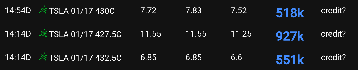 2024-01-14 TSLA 430c $0.75 → $3.75 ($750 to $3750 potential)