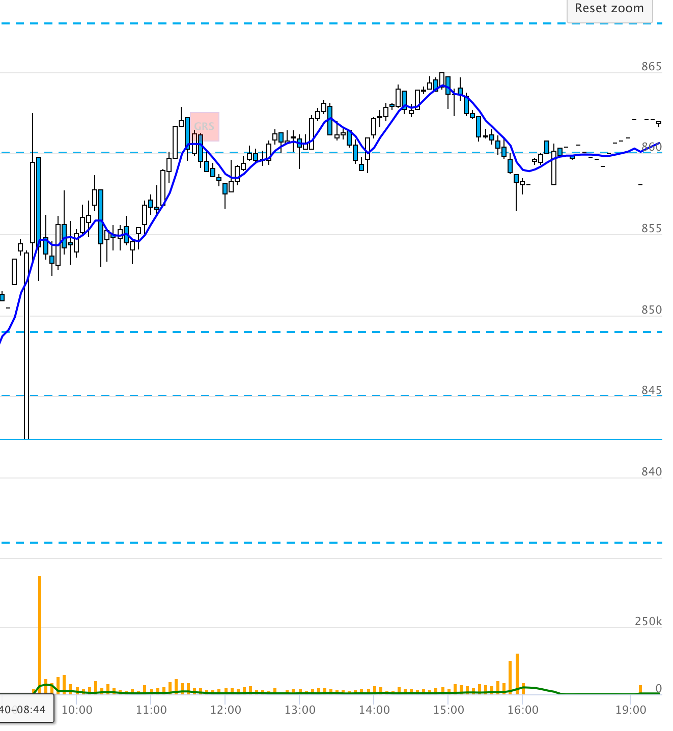 NFLX - Pushed on 860s again then based on 855 and slowly started to grind back over 860 and reached 865 before closing at 858.