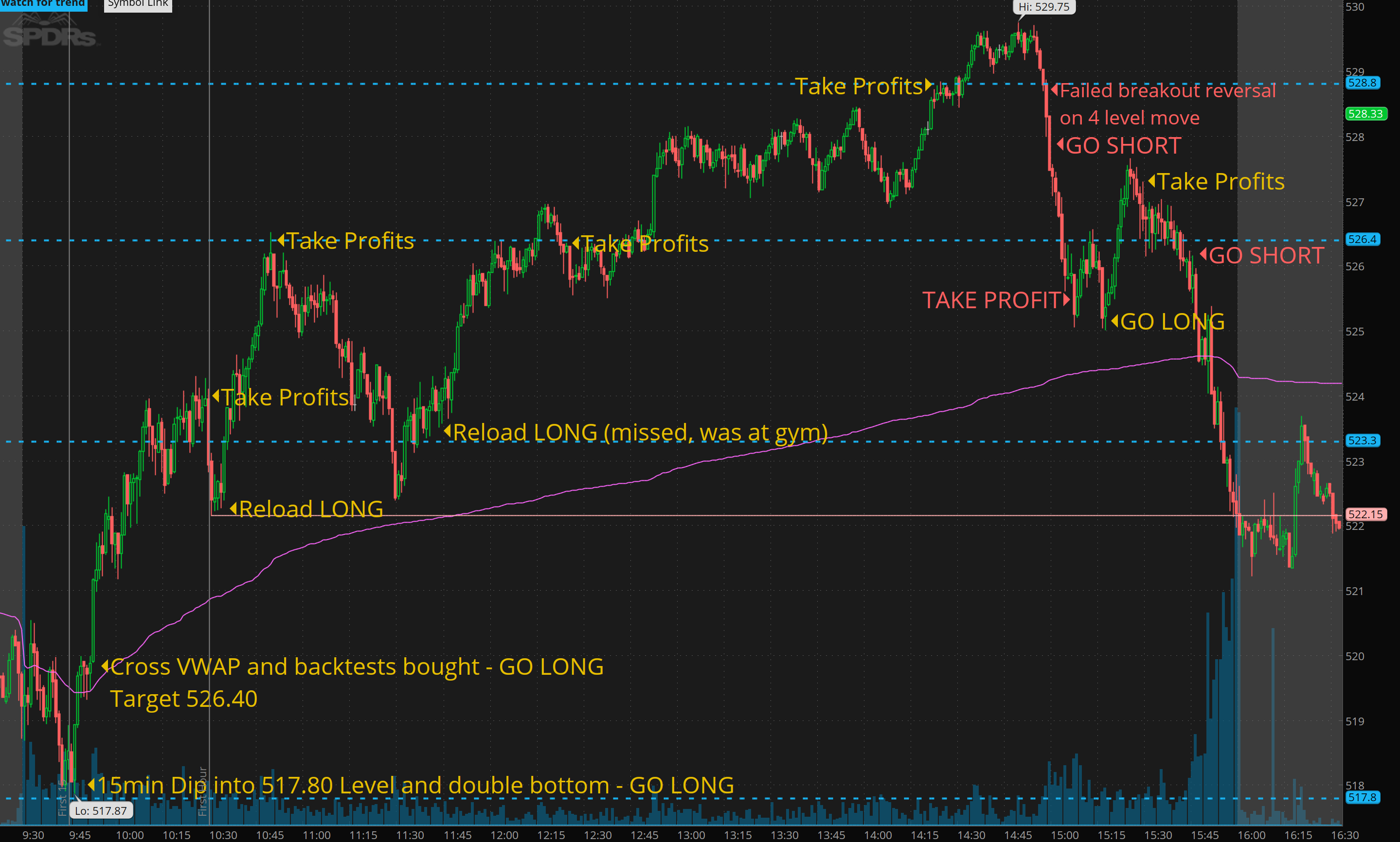 As you can see from the chart above, we had an early dip right into the 517.80 level, and quick reclaim above vwap. I used this as my trigger to plan and go long. I count 2 levels up at that is 526.60. That is my goal. And precisely where it reversed!