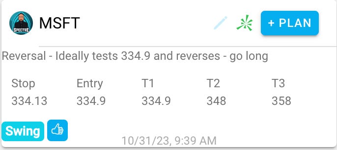 Tuesday, we took MSFT 335 calls for 4.50 risking $1. Hit $12 yesterday and could see $20+. 7 profit/1 risk= 7R. Solid trade so far.