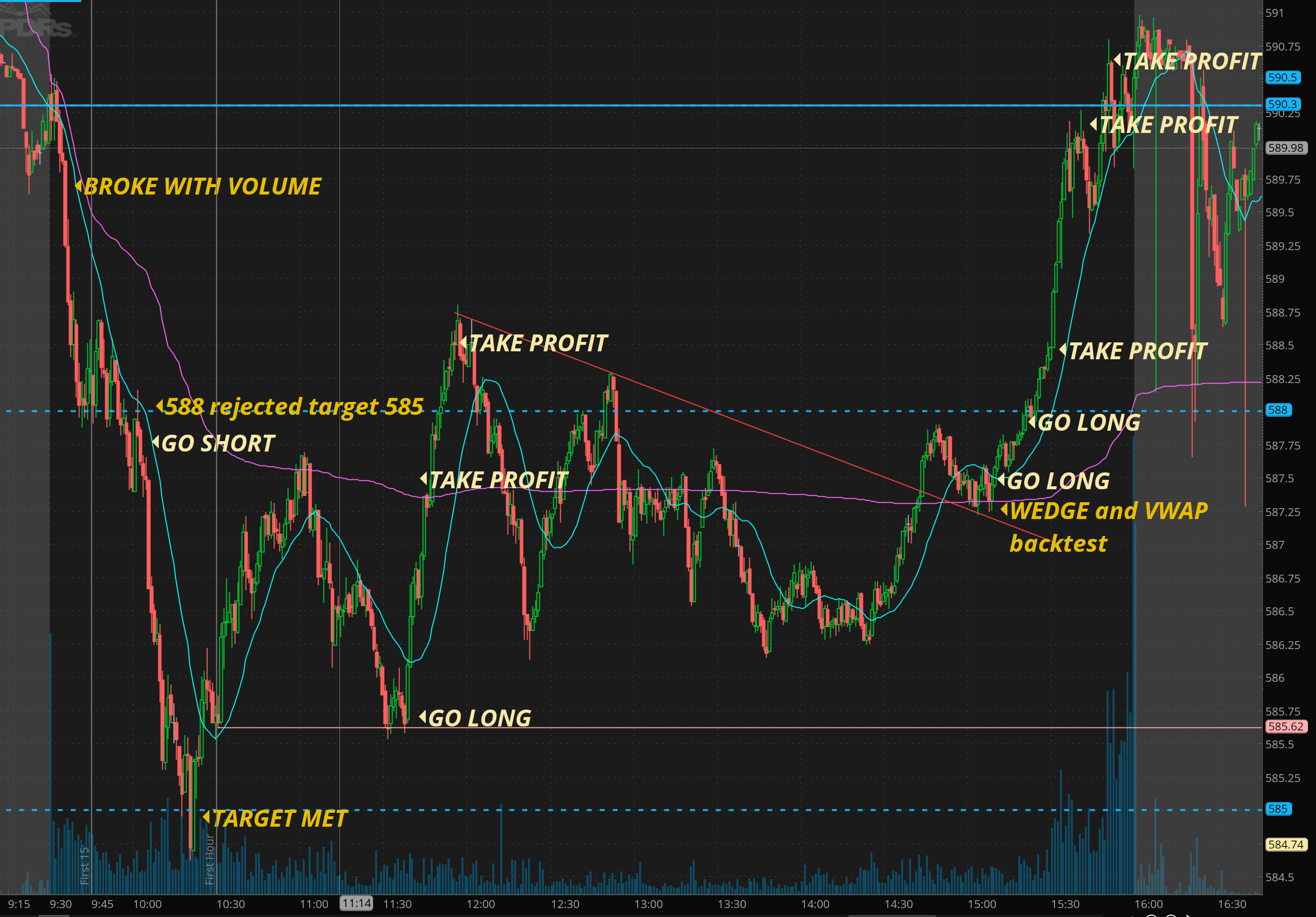 Good morning traders! The levels are magic! I wanted a dip to 588 to get long, I got the dip. Made a plan. Got stopped! Do I care! nope. It’s a process. So when 588 broke and then back tested and started dropping next level down is 585. We went short. AND when it got to 585, flipped LONG! using bull puts! both pull but paid out great!