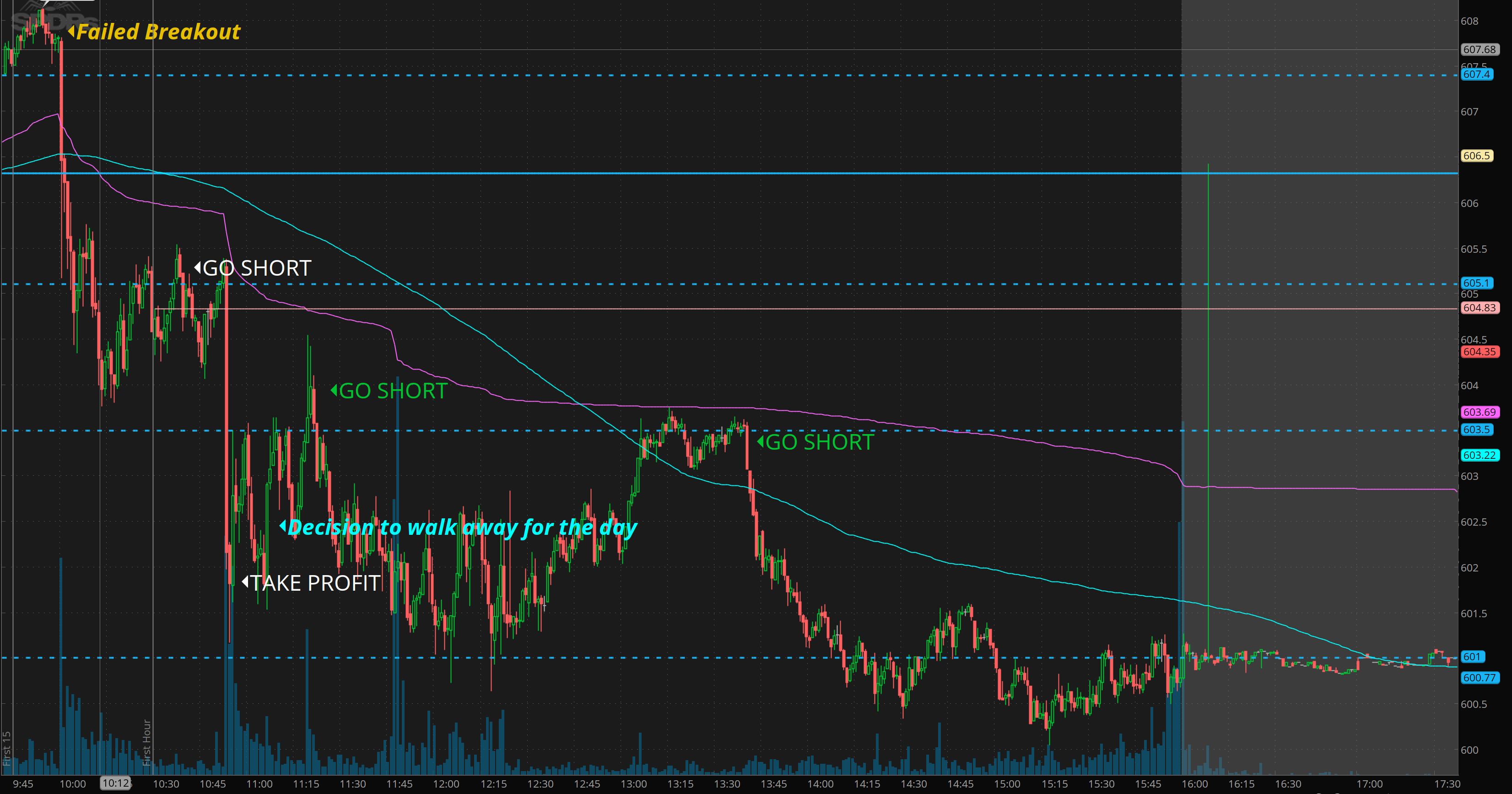 I was able to scalp puts, but after that action and seeing the chop develop and the levels broken, this action was not part of my plan for the day, and I tarted seeing a fight between 602 and 605. I decided this not the action I want to be a part of . I don’t have an edge, I dont like the juice in the contracts, and I’m not interested in a 100-200% trade. I wanted 500-1000%.