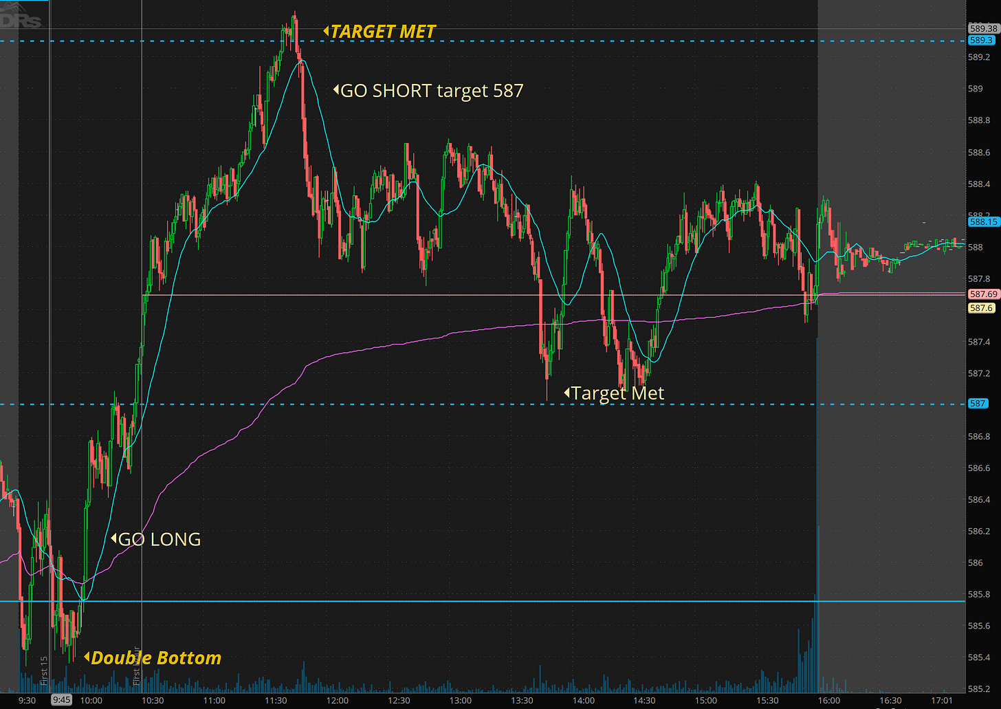SPY - nice dip and rip clearing 586.50 and running right to the 589.30 level. before fading off. LOVE THOSE LEVELS