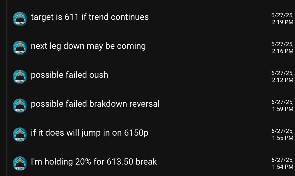 As for this morning I correctly read that Friday’s dump and recovery could be a failed breakdown reversal and a backtest of th 610.80 breakout. This implies market is looking for higher. Overall I think 625+ maybe as high as 640s can be coming before another leg down now.