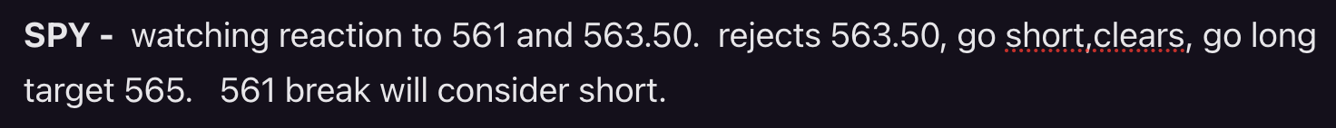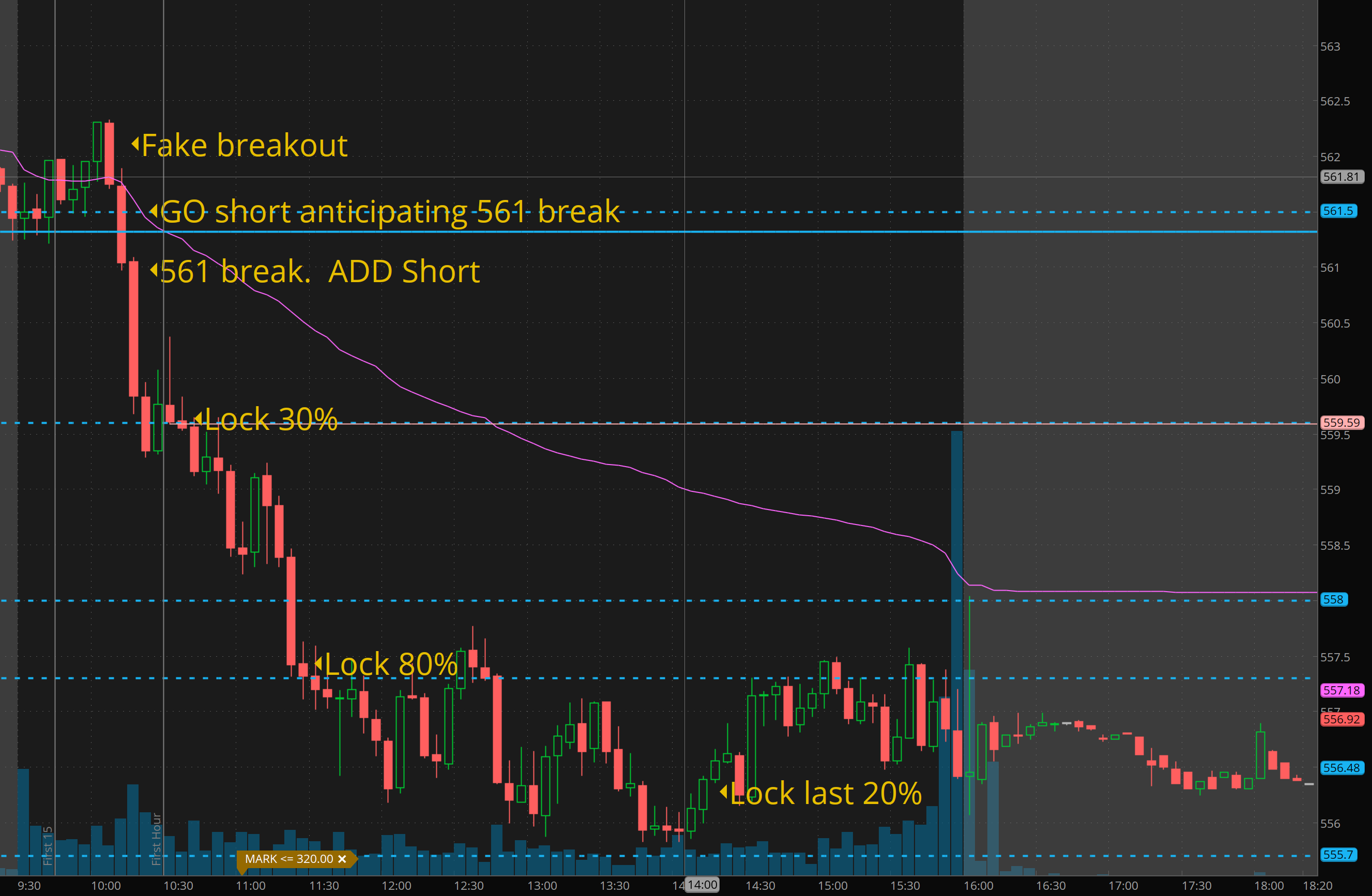Yesterday the 561 major support broke. I alerted I took puts on the 561 break.