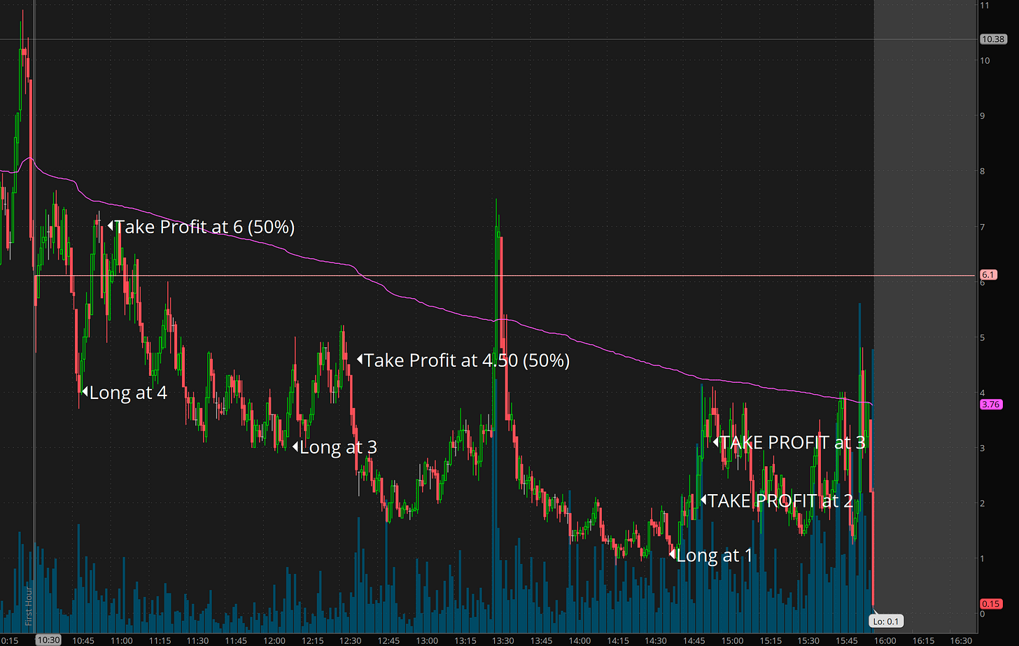 How do I take profits? I keep it relatively simple. Depending on the entry and range to the next levels I typically with take profits 50-100% of my profits at 3-10R and then raise stops to above entry with a goal of letting runners take me to the next level or 2 and to then reload if I believe we are consolidating before the next leg.