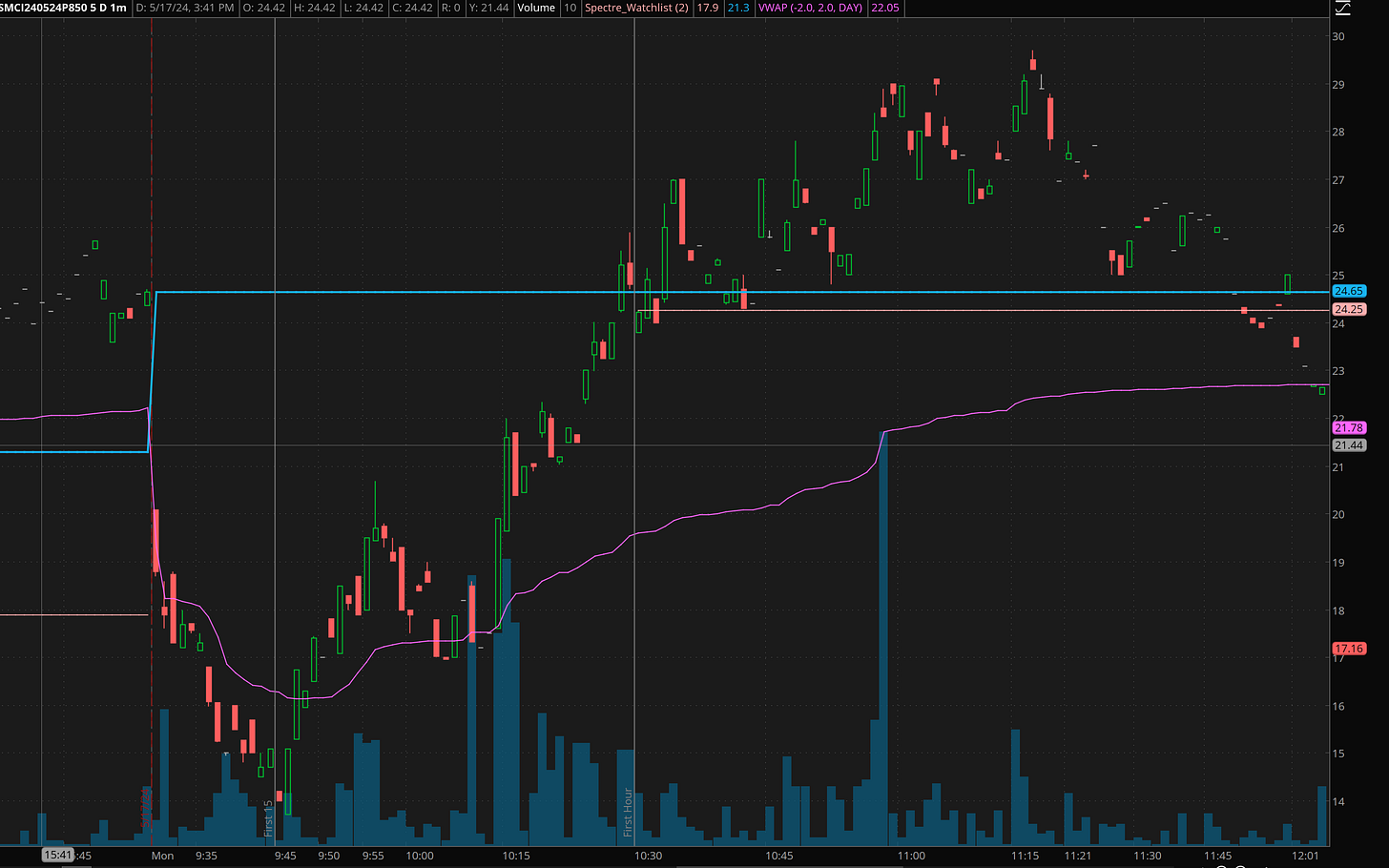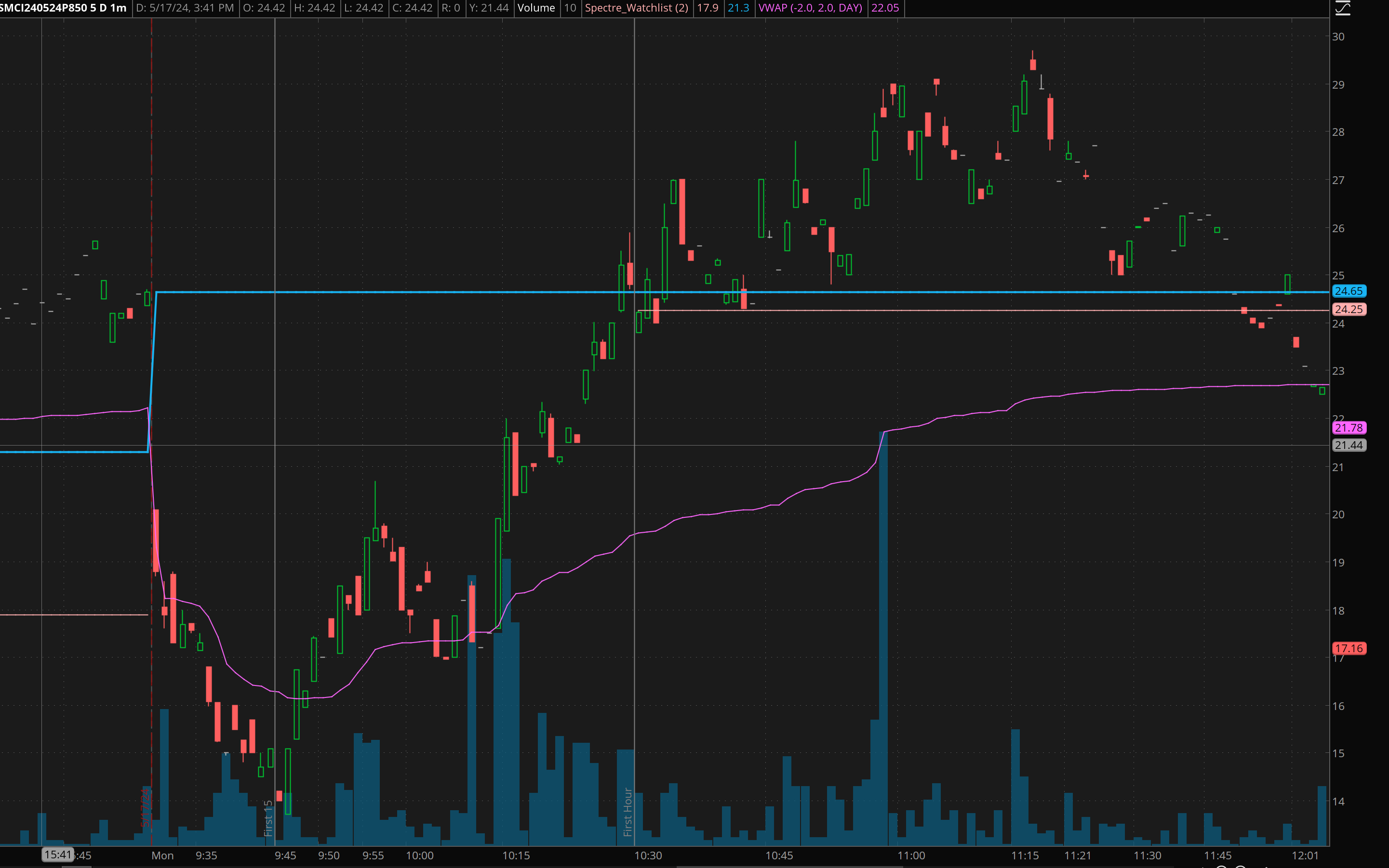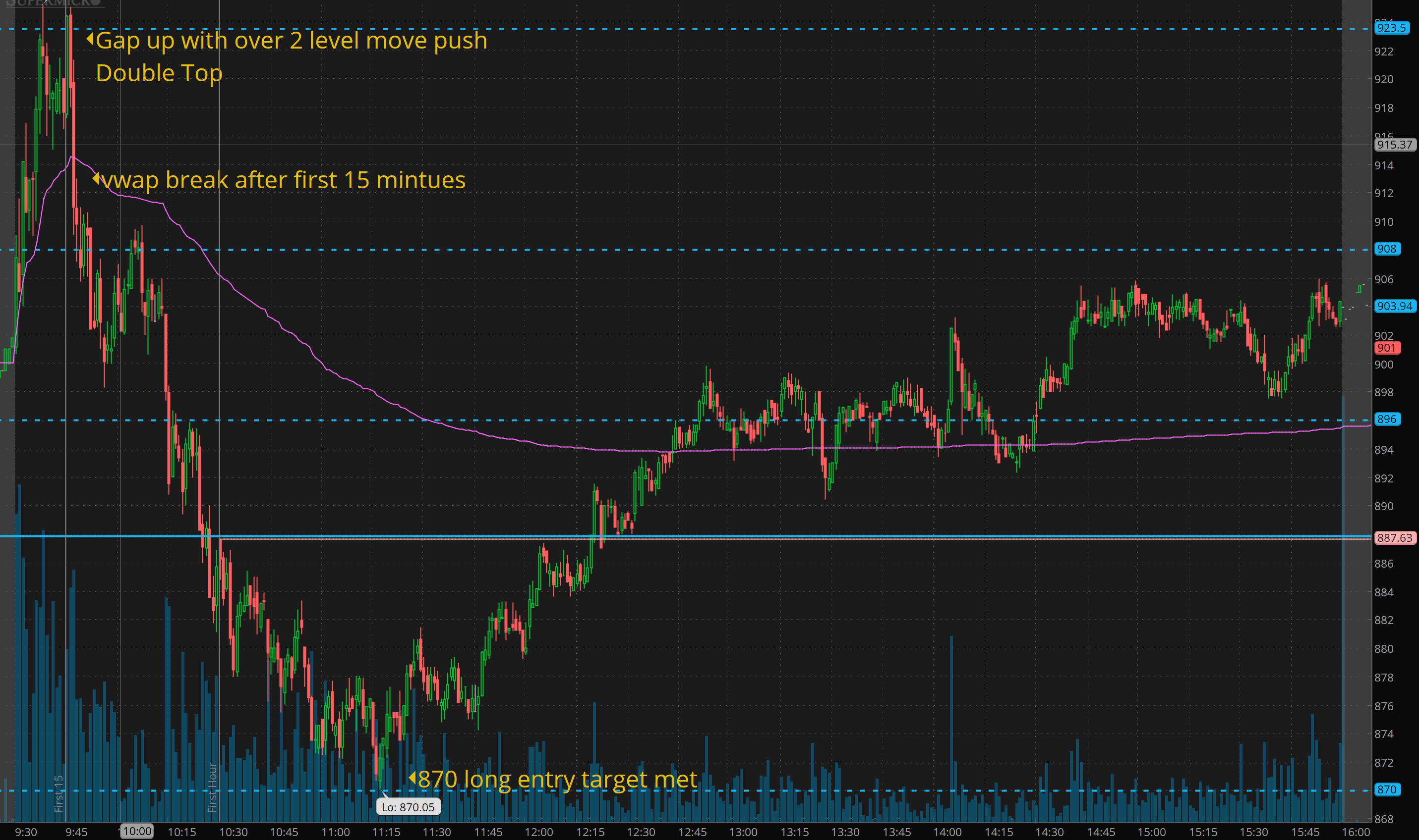 Yesterday I had said I wasn’t sure what to trade, however this is where having trade setups and monitor price action comes in. SMCI gave a clear gap up reversal trade. I unfortunately didn’t take it but did alert it. Instead I waited for 870-880 area to come to restart a swing long on SMCI. The contracts gained 50%.