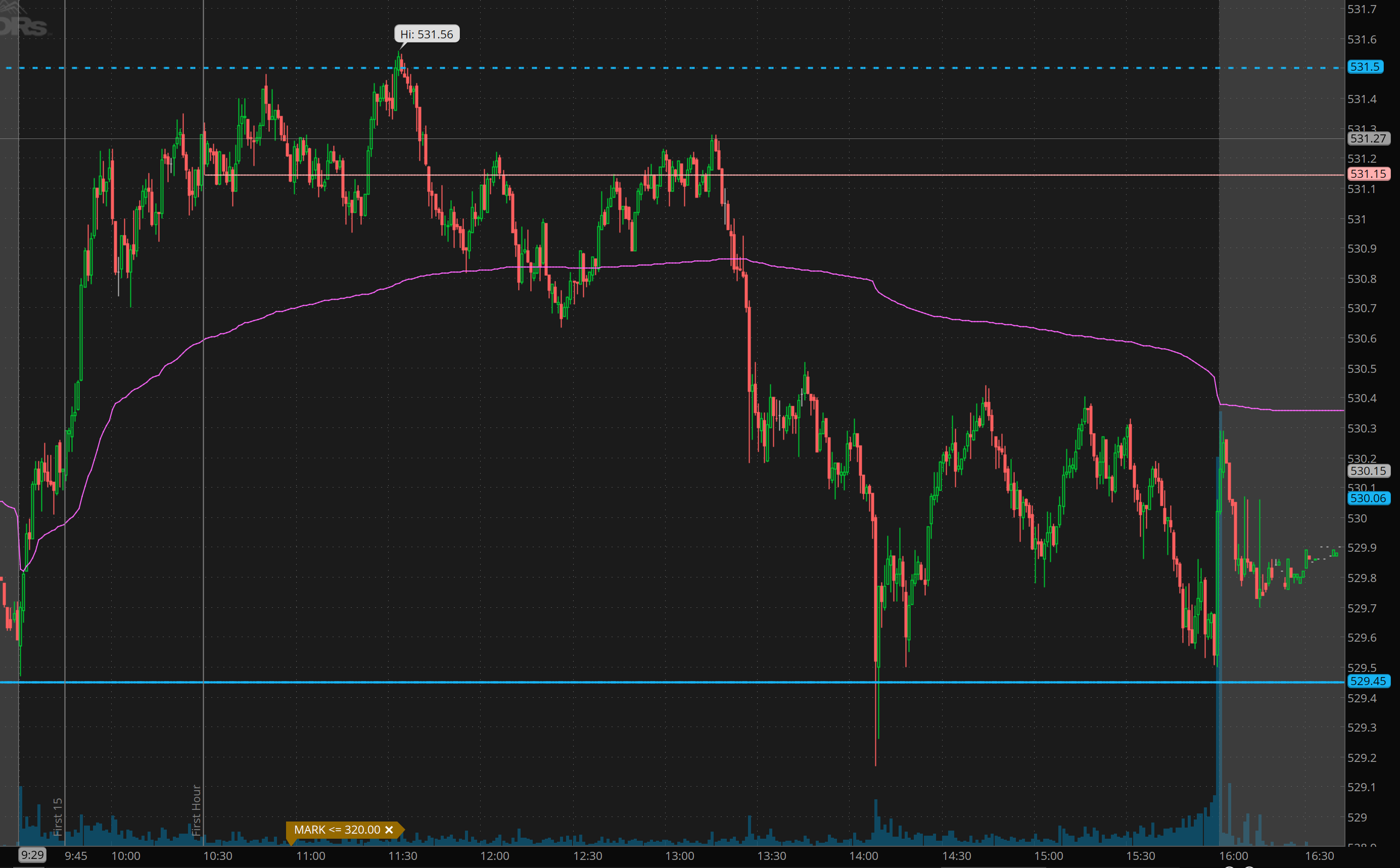 Yesterday I wrote, I wanted 531.50 to become support or a dip and rip long entry at 529.50. So after the first 2 hours we basically got a rejection at 531.50 and then flush into 529.50 for a long. Or you could do nothing.