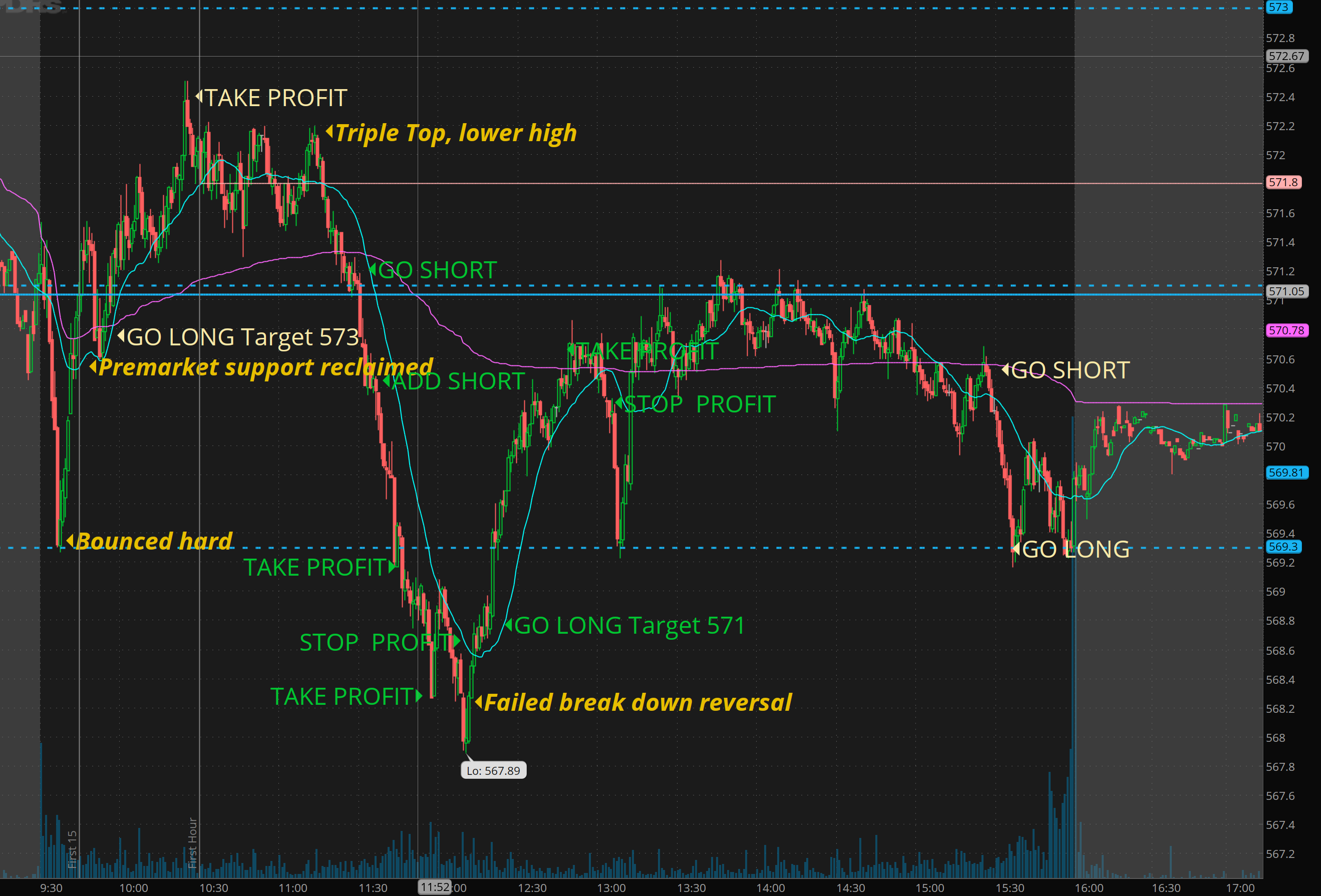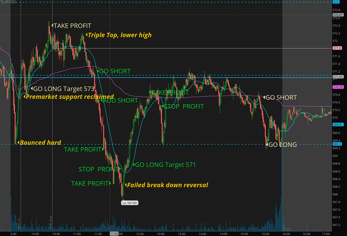 SPY - broke 571 and flushed into 568 and then quick bounced to test 571 again nd then consolidated most of the day and dipped to 569.30 level exactly!