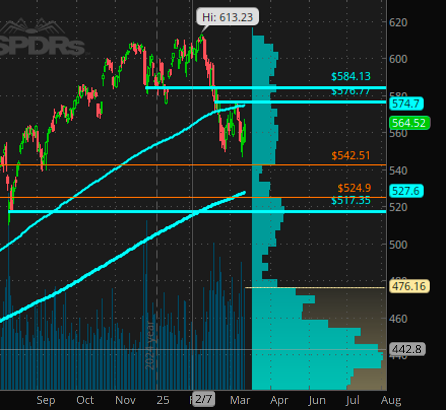 Overall based on overnight action, I consider the rally from 550 to 570 a short squeeze and the break of 550 as continuation of the downside move since Trump took office and the new Tariff protocols going into effect.