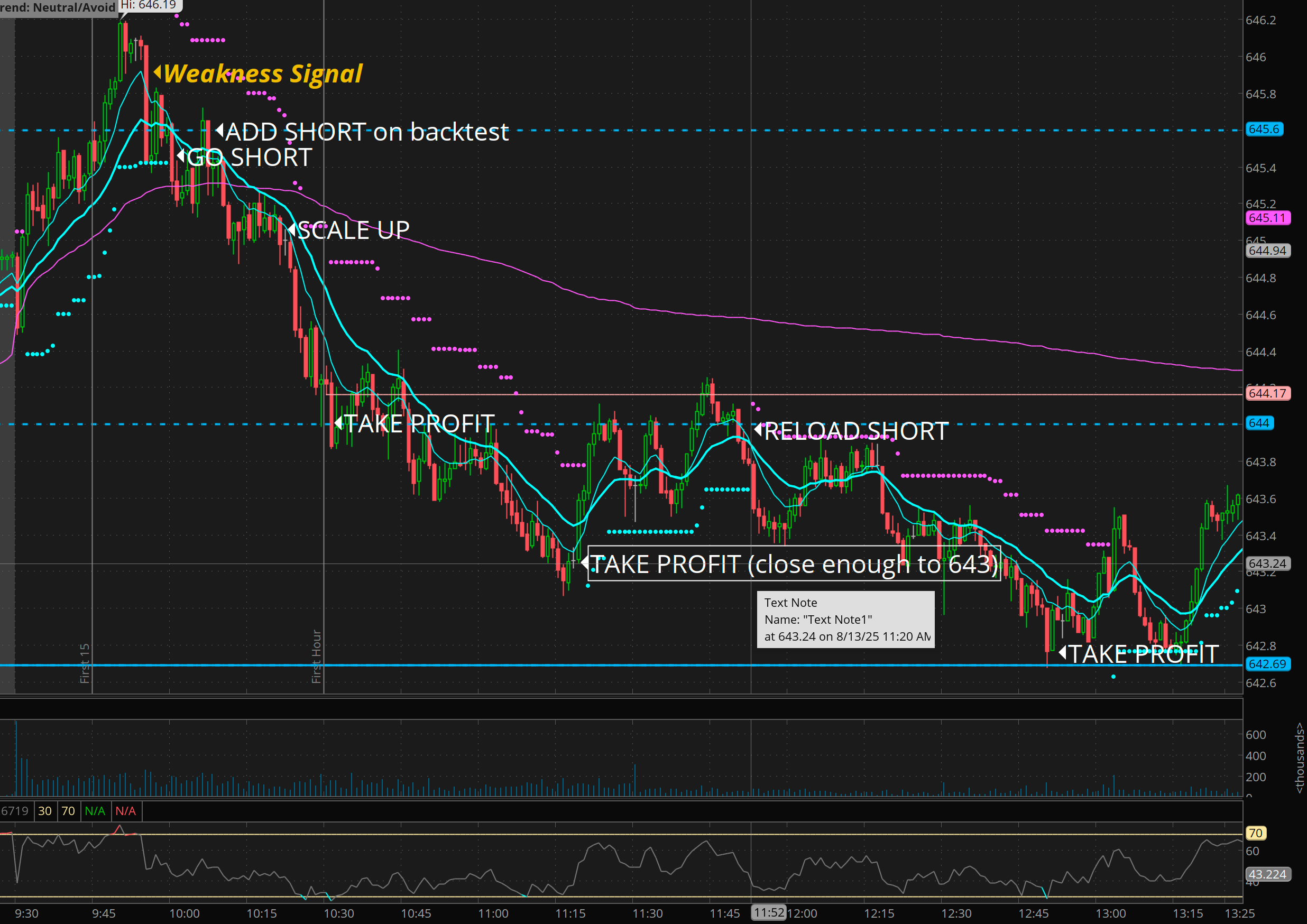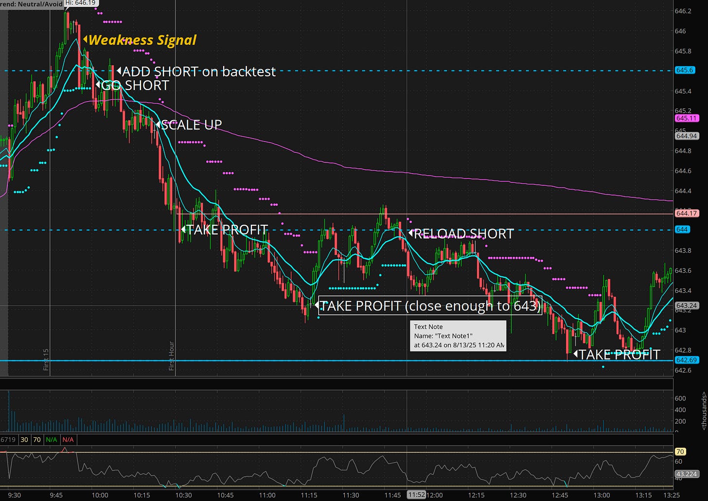 Notice the weakness signal… and then the back test of the 645.60 level and reject, then the vwap break… That was the IDEAL pattern.