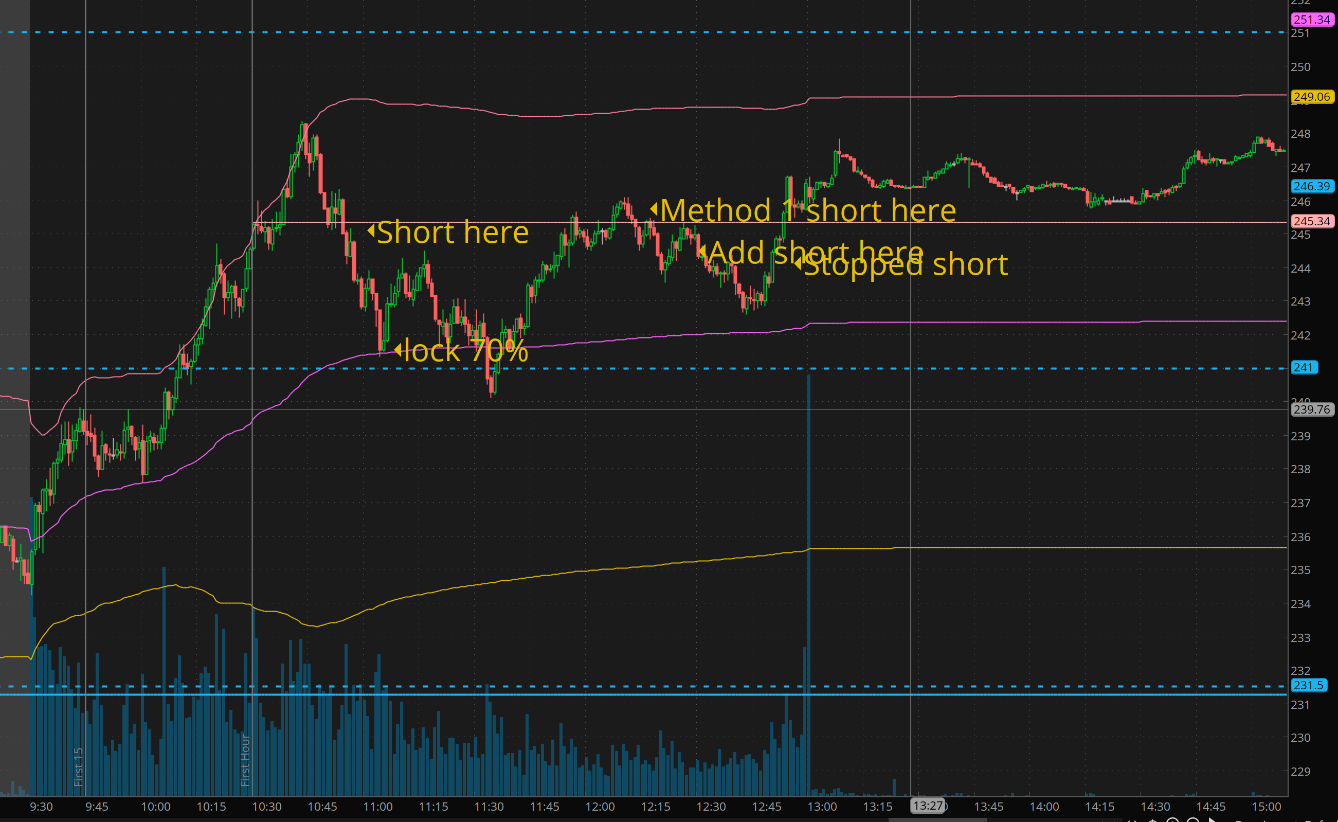 Give the gap up and sharp rally, I was looking for a short. once the 10:30 level broke got short and we got a nice flush into vwap. but I wanted gap fill and the pelosi news game me a reason to go for it. After the vwap bounce, I was expecting previous peaks to be testes around 246, so using method 1 entry, I started short and then previous lows broke I added to the position. Was working great. Almost getting to vwap, but then it bounced hard back near where I added — I cut the trade. I don’t need it to work. If I was right it should have broke vwap and continued dumping! It didn’t and the way the buying is going 250-270 is def on deck for TSLA now. 243-245 is the key area I will watch for a break for start a possible short, until then BTFD. or scalp short on rally exhaustion.