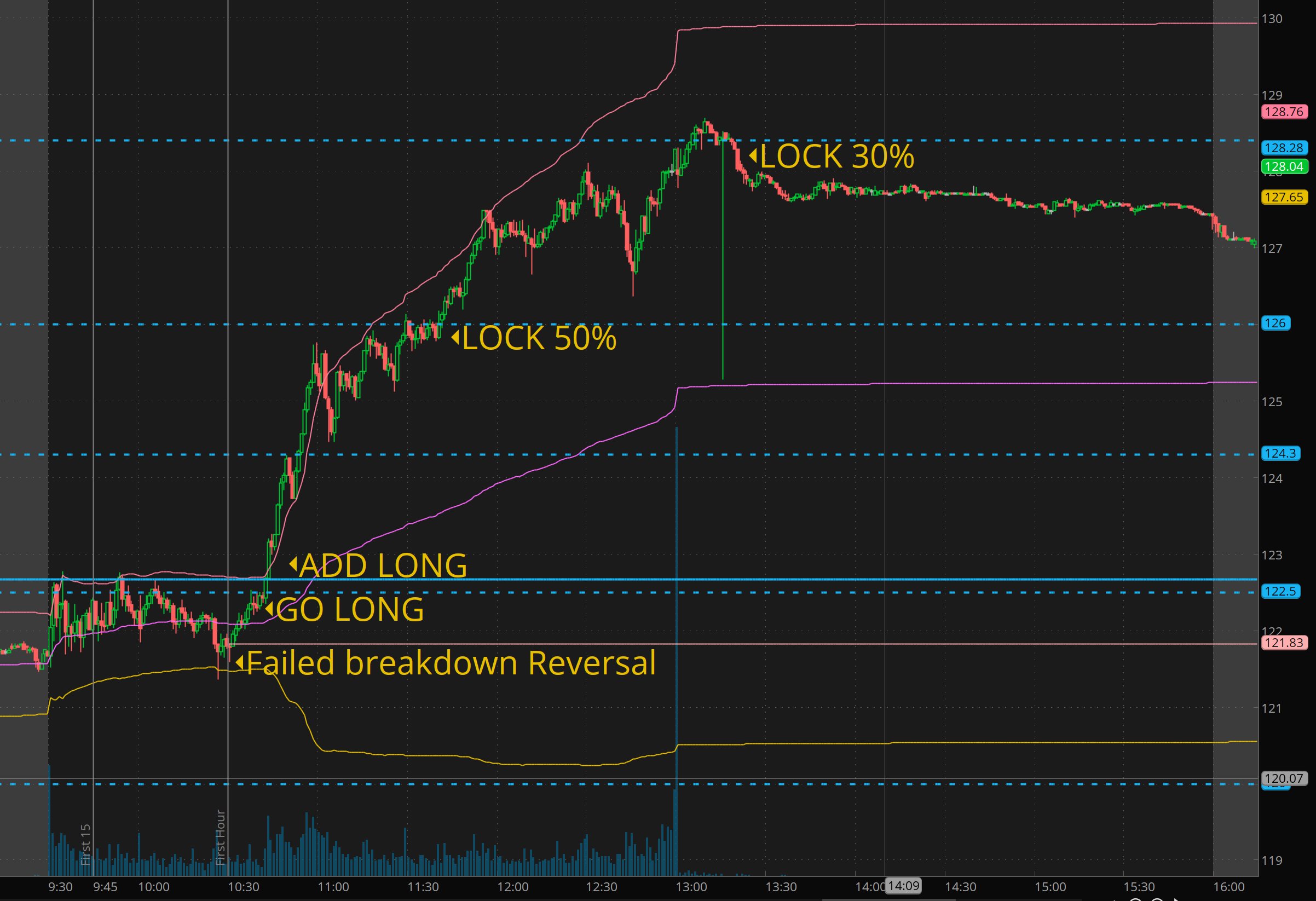 Review the chart above to see how to read the price action and and suggested process for entry, adds, and taking profit. Notice how it is systematic. We begin takeing profitls at 2 levels away. On the first level. I watch, and once it clears, I raised stops to the first level, but I want to take 50%-70% at the level 2 target.