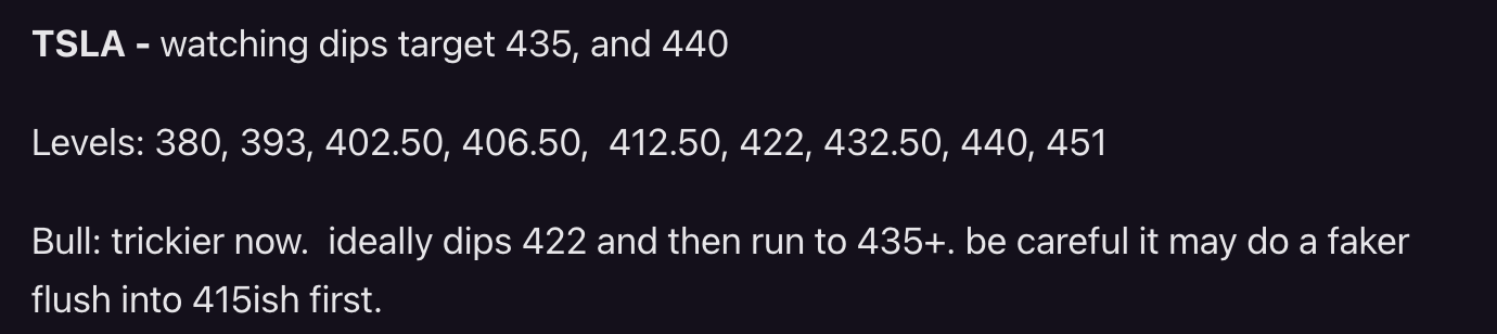 TSLA - Gave 415 dip, and pushed but acting a little tired now. lets see if the momo comes back in today or if needs to pull back and consolidate before more upside.