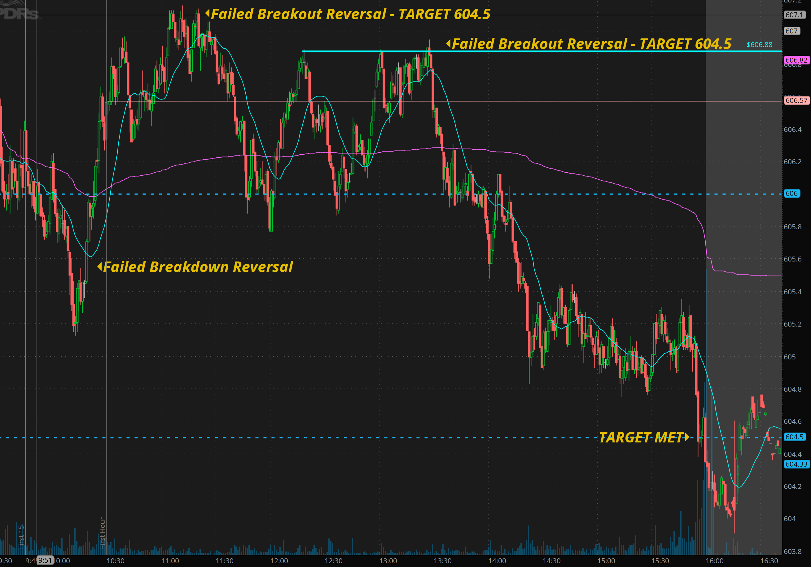 SPY yesterday was tricking after gapping down no surprise about the gap down reversal to the upside, but then here is the thing, it did a failed breakout… As such I had my locked on getting 404.50. I kept telling THT pro members that I know it looks bullish during the lunch time consolidation, but my gut screams we need 404.50 test before we can go higher… Sure enough we got it! Check the recap to see my price action reads