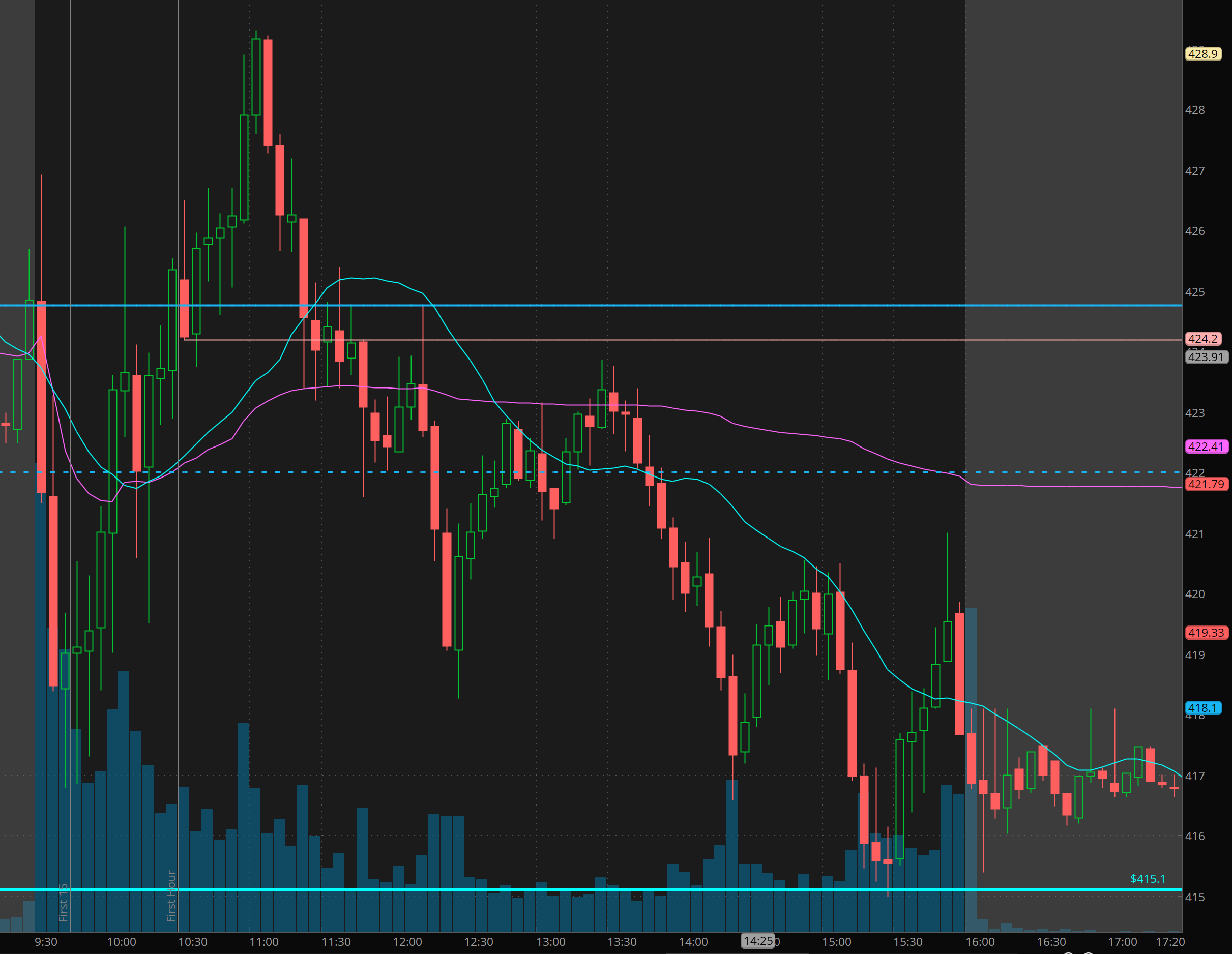 Yesterday I warned bulls that we may get a flush in 415 before its ready for higher.