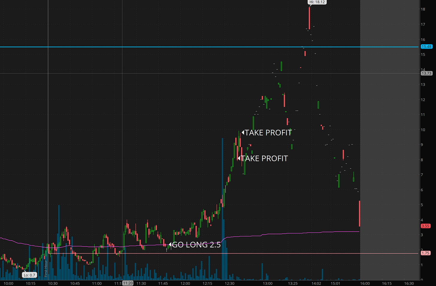 How do I take profits? I keep it relatively simple. Depending on the entry and range to the next levels I typically with take profits 50-100% of my profits at 3-10R and then raise stops to above entry with a goal of letting runners take me to the next level or 2 and to then reload if I believe we are consolidating before the next leg.