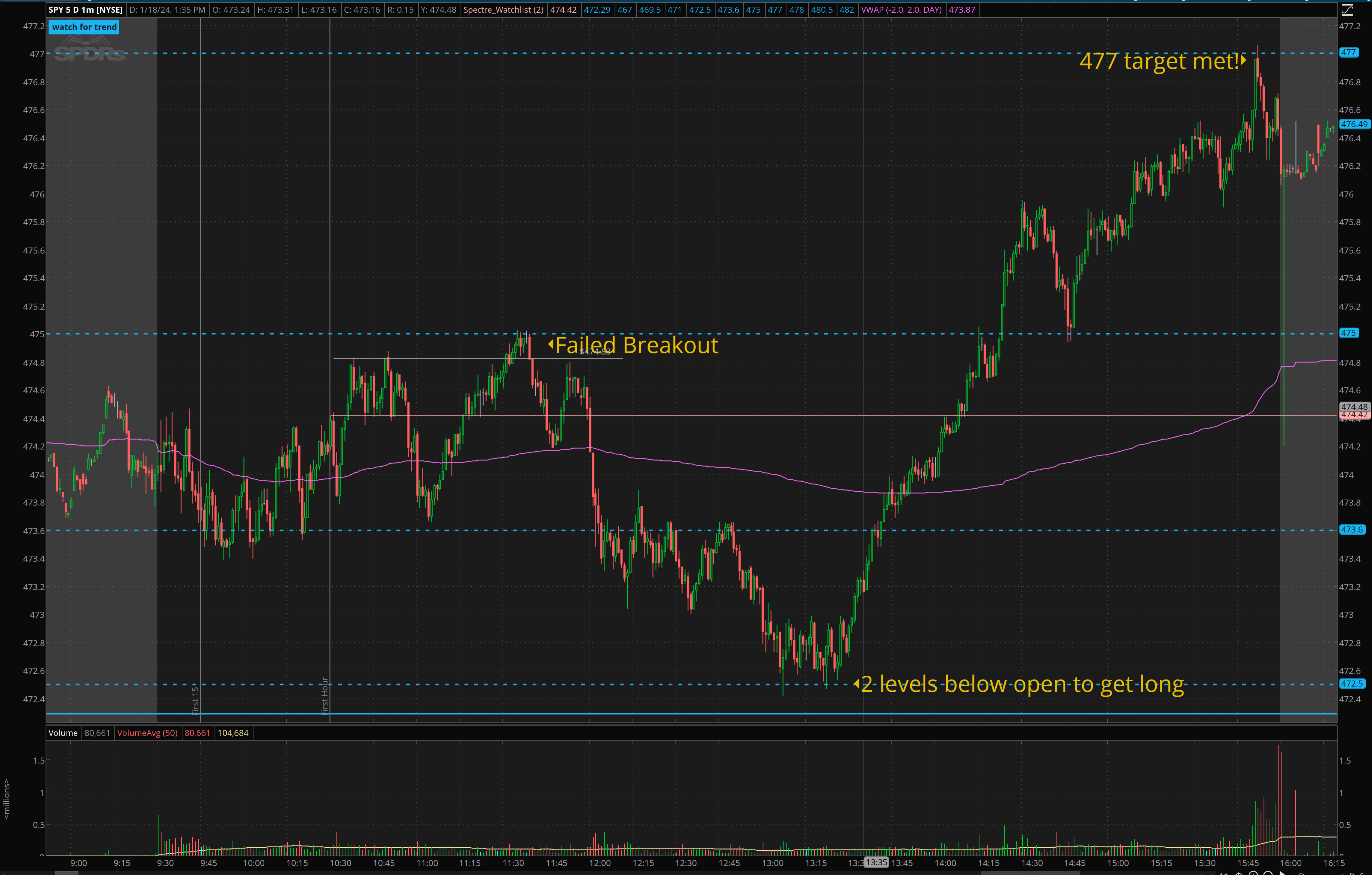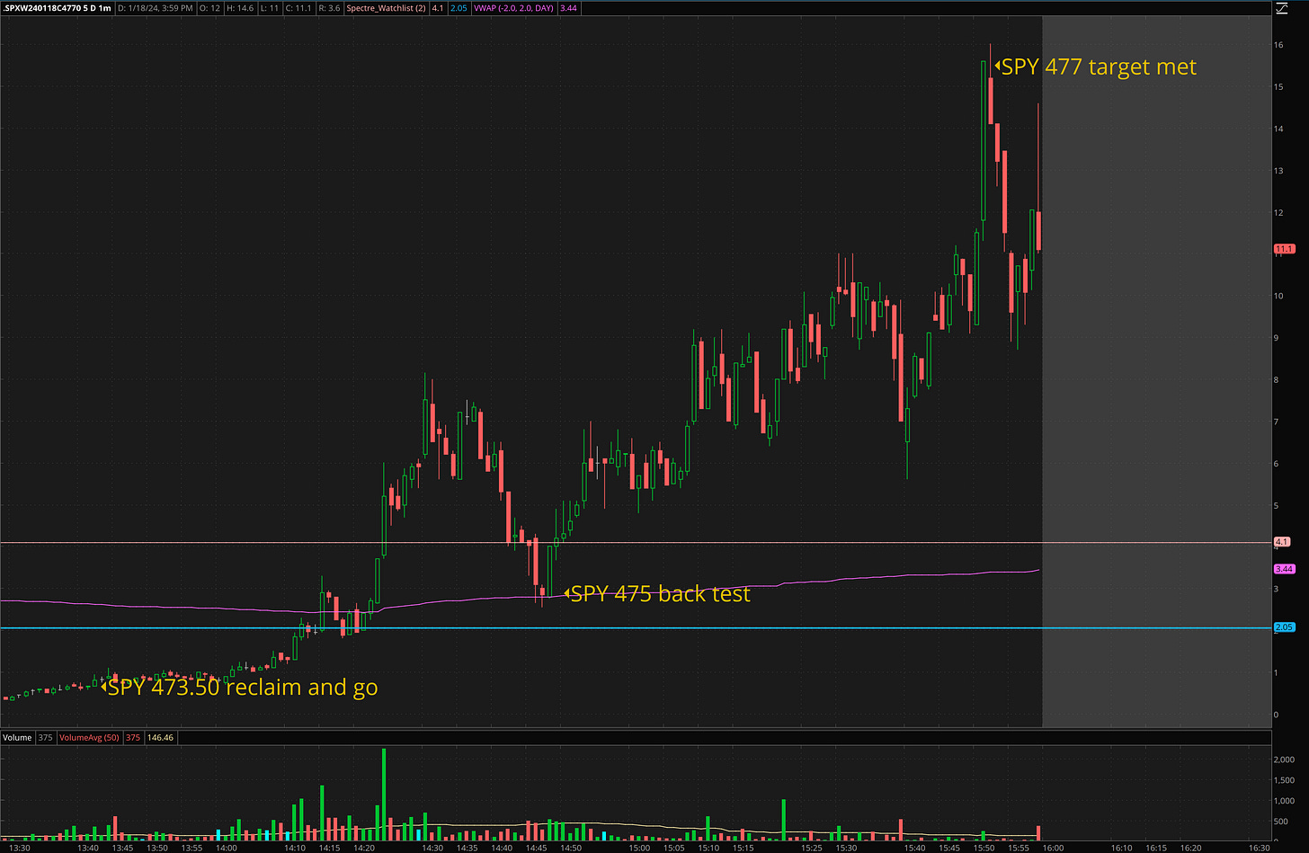 SPX 4770c I was trying to fill for 0.20-0.40 for size and took a chase size at $1. Notice how even though the 473.50 level was reclaimed, the acceleration didn’t come until VWAP was crossed.