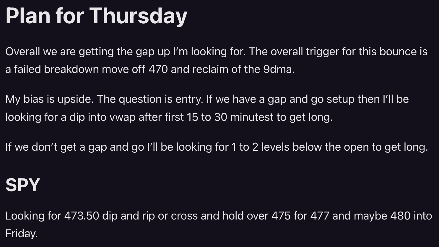 I’m looking to go short for a gap up reversal play. We are near all time highs. In theory the first test should reject and we get some gap fill. Once that comes, I’ll look for a bounce for a long. Roughly looking at SPY 480.50 and 477 as the key levels.
