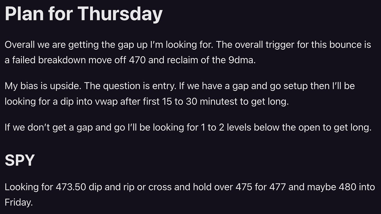 There were 2 trade setups here. The first is to watch for the fail/exhaustion since we didn’t get a strong gap and go move. that happened right at the 475 level. once can target 473.50 and 472.50.